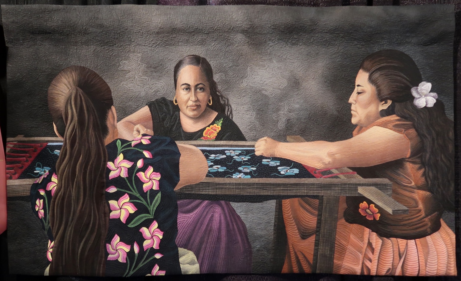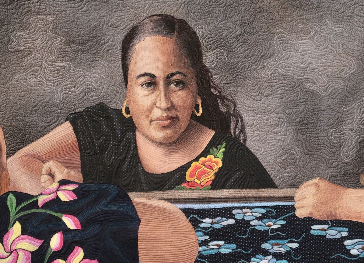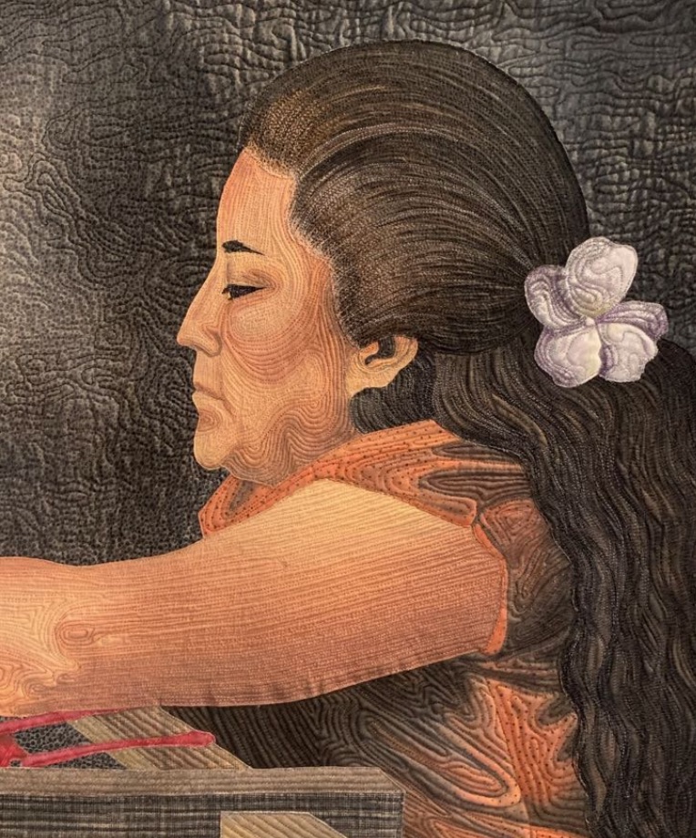 Linda Anderson's quilt, Velvet Flowers, recreates a lovely scene of women in the village of Santa Rosa, Oaxaca, Mexico, as they work on embroidering hand-stitched flowers on velvet. They chat back and forth as they create the style of dress worn by Frida Kahlo. Linda writes, "Flowers continue today to dance across the rich clothing on the solid women on this land." A beautiful sentiment for an extraordinary quilt.
