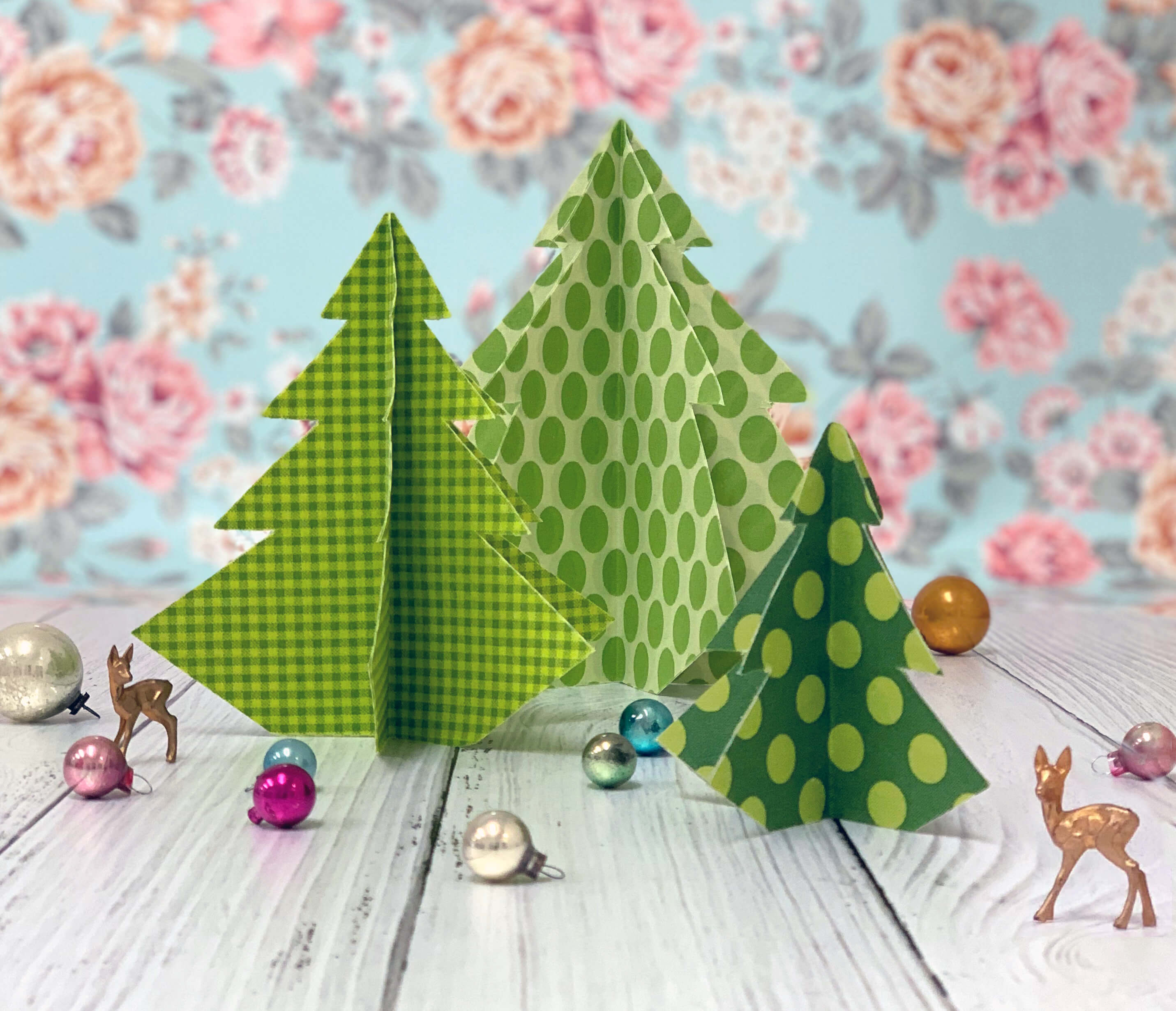 - Fabric scraps. We used five squares of fabric for each tree. The large tree was made with 8" squares, the medium tree was made with 6" squares, and the smallest tree was made with 4" squares.