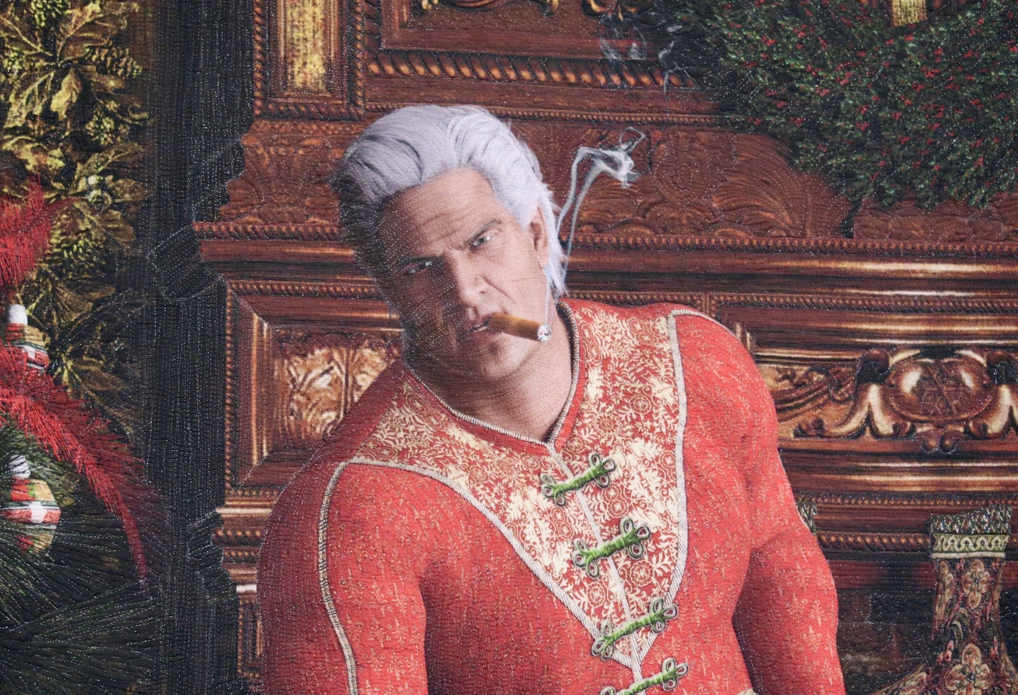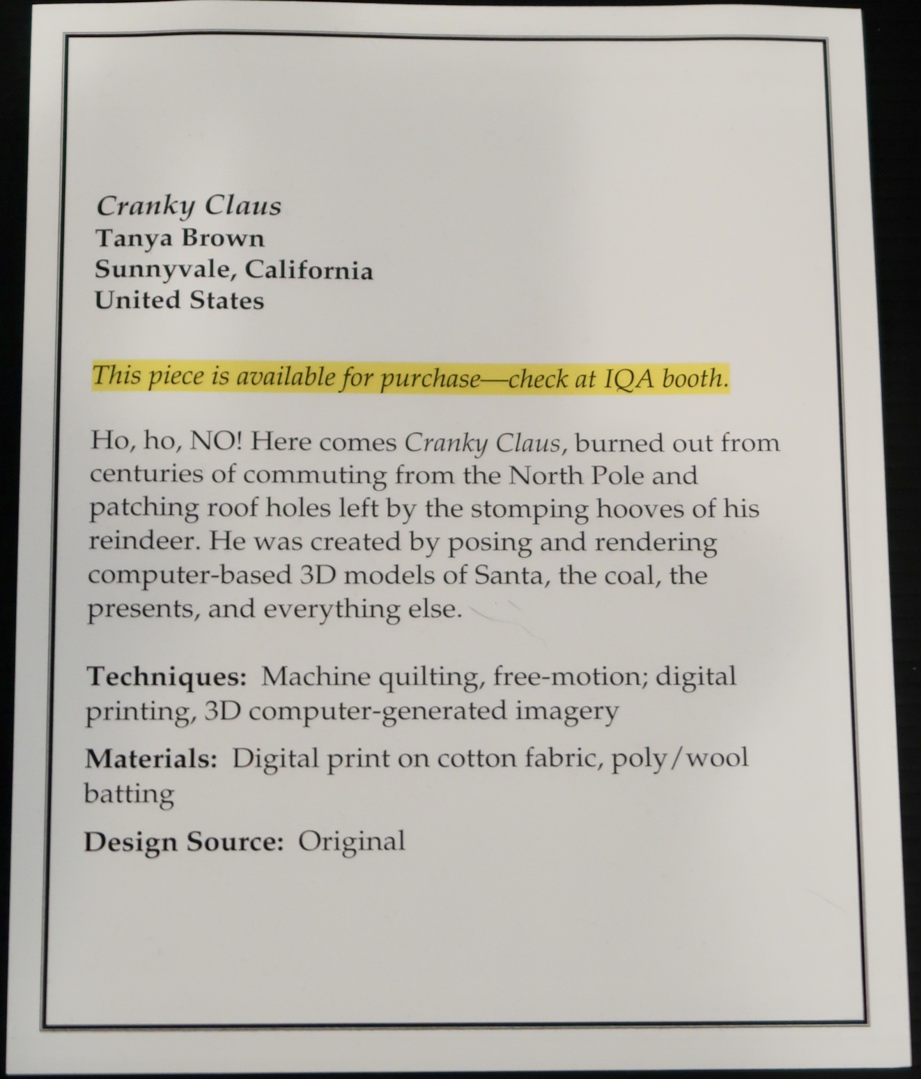 Tanya Brown's Cranky Clause is a completely different perspective on your usual Santa. He was also made in quite an interesting way by posing and rendering computer-based 3D models of Santa, the coal, the presents, and everything else. This Santa might be burned out from centuries of work, but Tanya's quilt is "on fire."