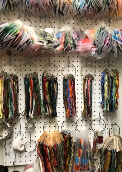 Organization is one of those traits that every stitcher aspires to, and yet only a few attain. But let me tell you, Anne has it down to a science, and if they gave out PhD's in thread organization she would be the head of that University Department! First, I must share with you that Anne quilts, embroiders, appliqués, cross stitches and English paper pieces. Which means we are talking serious thread accumulation. One of the number one tools she uses to organize...a peg board!