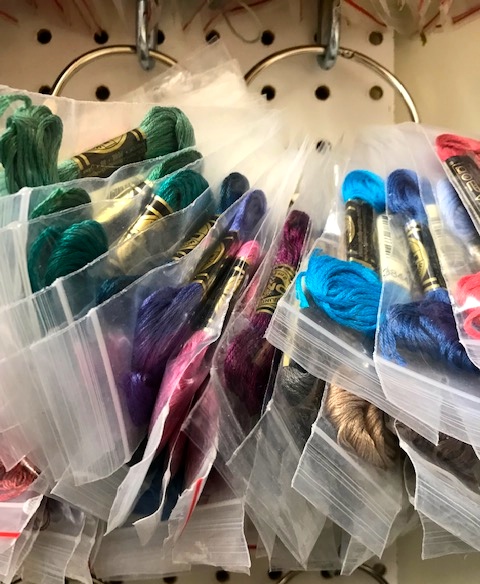 For her DMC, and those threads that have no hanging tag, she places them in tiny plastic bags so you can see the color and number of the thread!