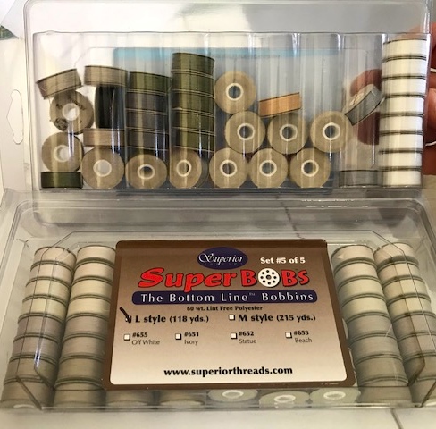 Her appliqué threads are stored in a special drawer, which was an option with her sewing table, and she also has available pre-wound bobbin threads in a variety of neutral colors which are from Superior Threads and fit most domestic machines.