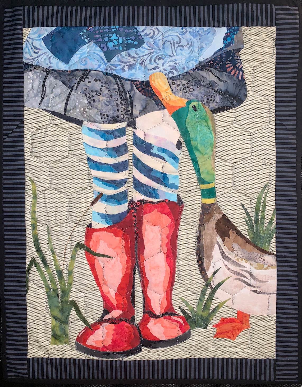 My piece is called “Howard and Katy.” The subject came about from two different ideas. One was an inspiration from artwork by a Canadian Artist – Angela Morgan. The other from a casual conversation with my International Partner. The name is derived from the town that my Partner lives in – Katy and well, Howard is just a typical Duck name! This conversation was about red shoes and how I believe that “every girl should own a pair of red shoes”….. Doesn’t matter what they are ….. just red shoes. I grew up on a farm and my husband and I just sold our farm that we had owned for 17 years, where our Children grew up. Also knowing that my Partner is an avid animal lover, I thought that the subject was appropriate for both of us. My Partner and I both agreed to do art quilts and my idea was that it was to be solely fabric (no other medium). I used mainly Batik fabrics to achieve shading and colour. The quilting was done to represent the chicken wire in a chicken coop – although I have a Duck - and that both Katy and Howard are behind the wire fence.