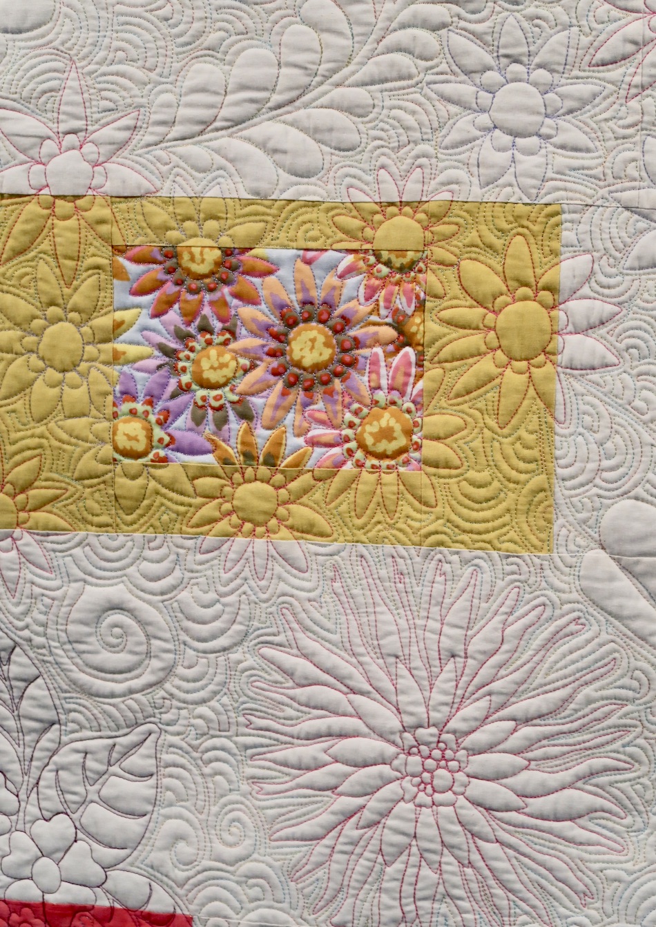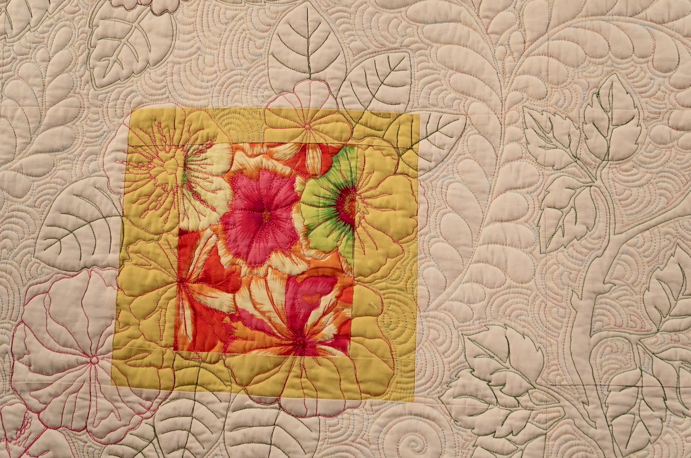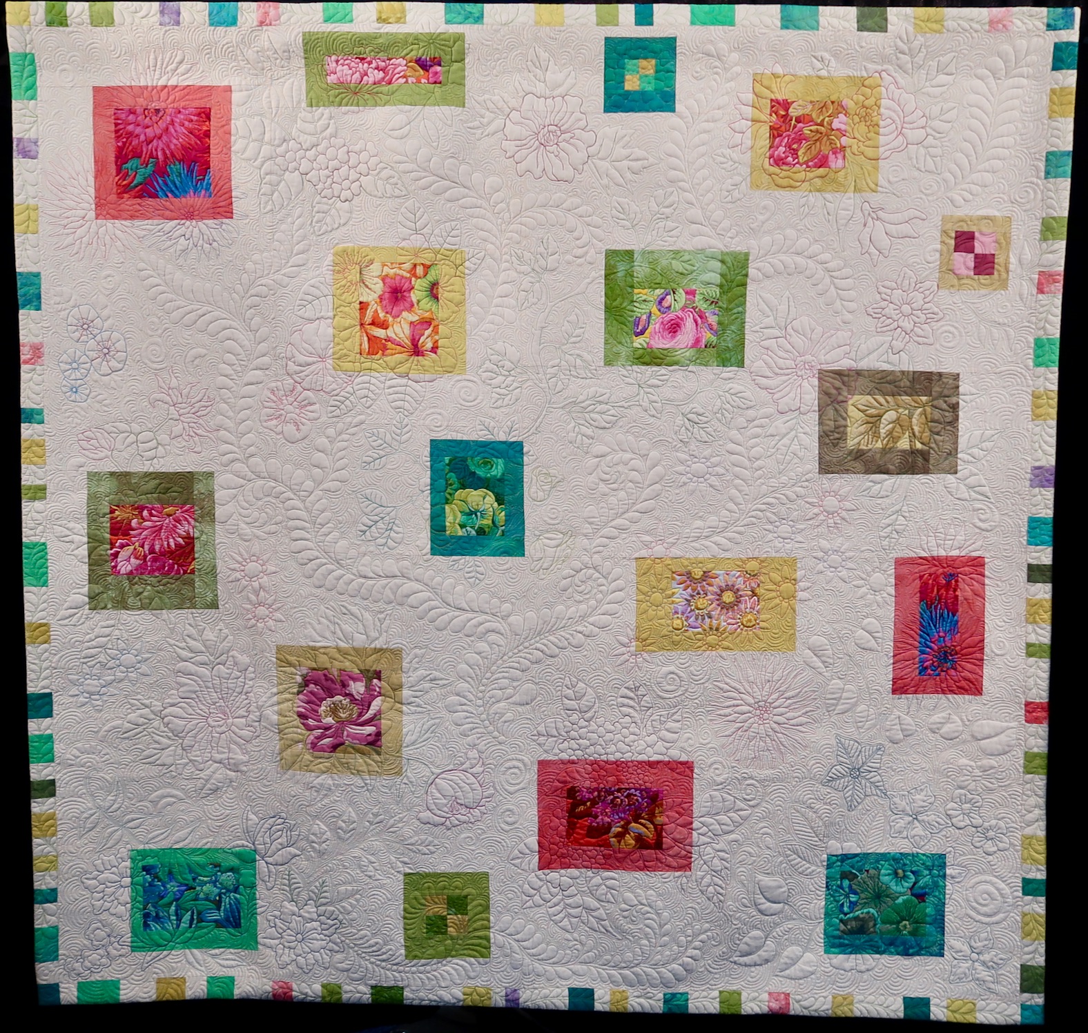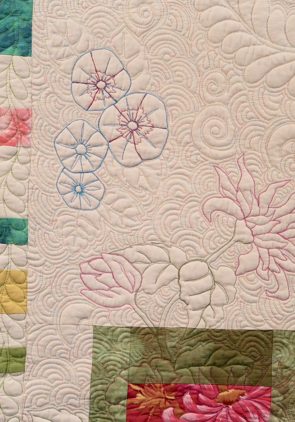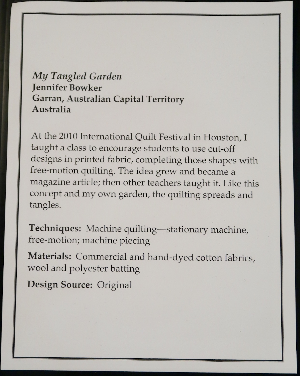 Jenny Bowker taught a class in 2010 to encourage people to use cut-off designs in fabric and then completing those shapes with free-motion quilting. My Tangled Garden is an amazing example of that technique. Jenny's quilt was on display at the Houston International Quilt Festival 2018.