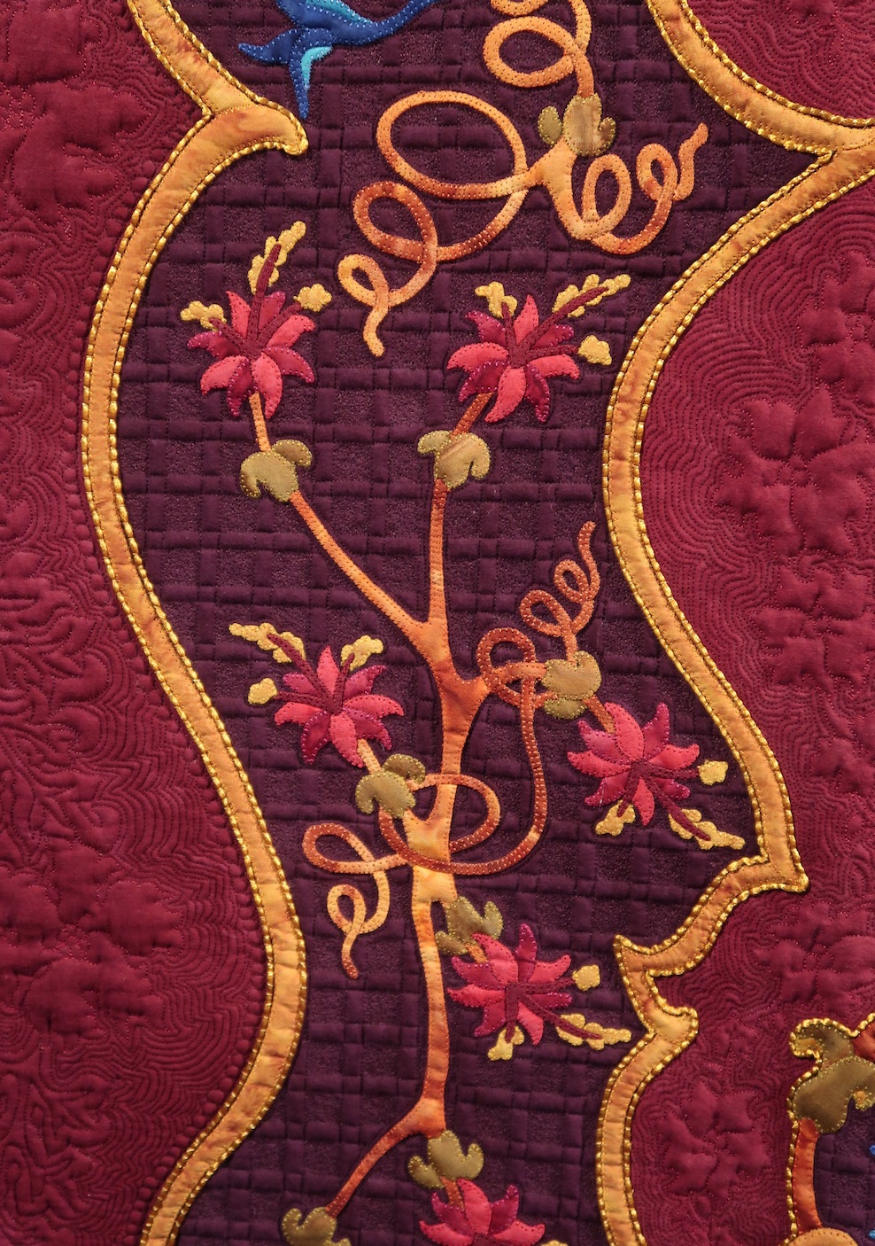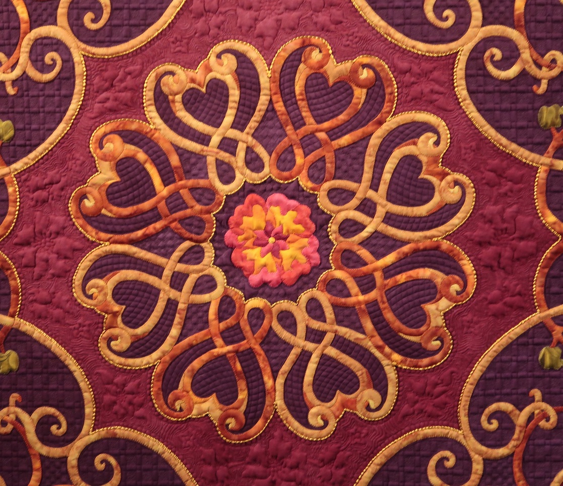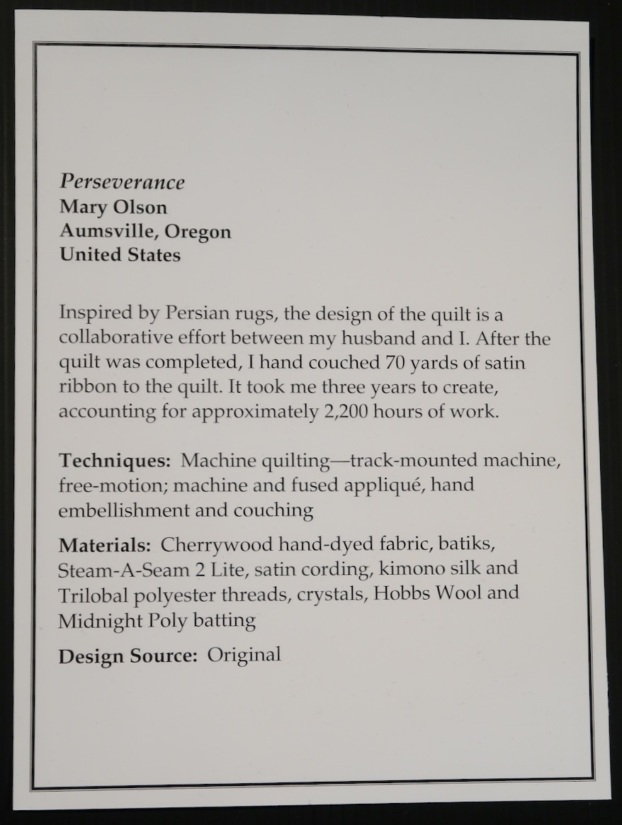 Mary Olson's quilt, Perseverance, was a collaborative effort with her husband, Garry. Inspired by Persian rugs, it took Mary three years to create (approximately 2200 hours). After she completed the quilt, she hand couched 70 yards of satin ribbon. We would say that's Perseverance.