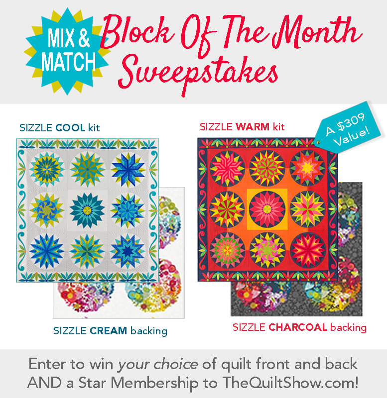 Win Becky Goldsmith's 2019 BOM Sizzle kit in a WARM or COOL color way, your choice of 5 yds. of backing fabric in CREAM or CHARCOAL, and a 1-year Star Membership to The Quilt Show.com!