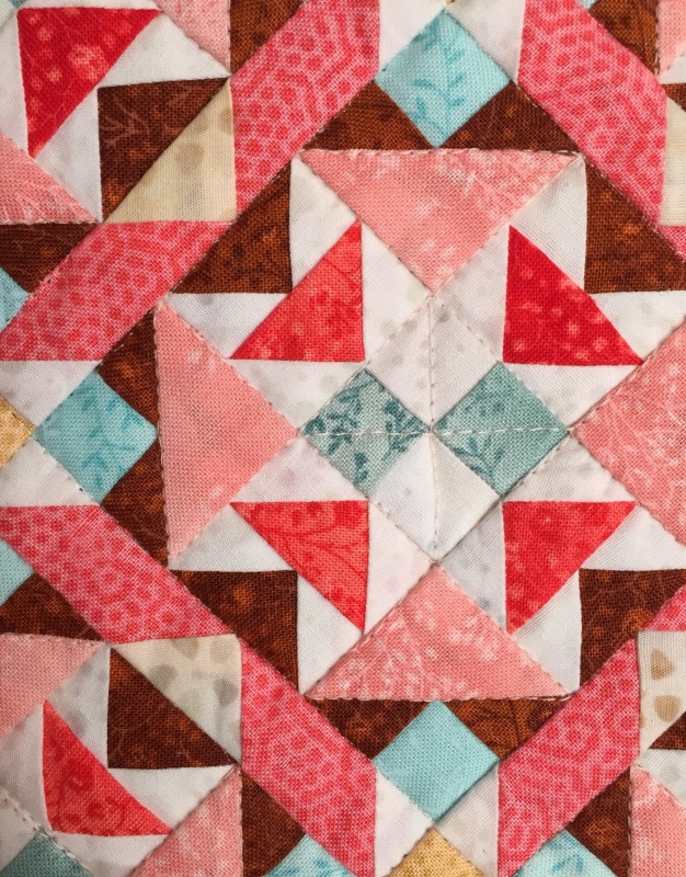 I don't consider myself an artist, but I am a passionate craftswoman. Making a miniature quilt was an extreme challenge for me. My exchange partner and I have very different personalities and each has her own very individual mode of making quilts. But there is one thing that connects us and that is a love of the American quilt designer Bonnie K. Hunter. At the end of every year, Bonnie presents her followers with the gift of a mystery quilt. I have been making these mystery quilts with great enthusiasm for a number of years. The 2017 mystery was "On Ringo Lake". My exchange quilt is an almost exact representation of this design, at a scale of 1:3 - homage to Bonnie and at the same time a miniature lake for my exchange partner. For the choice of fabrics I was inspired both by the original design and also by a photo sent to me by my partner, whilst at the same time keeping with my own personal preference for more sedate colours. And honestly, how many people get to hang a miniature lake on their wall?! Foundation paper pieced by machine, Machine quilted.