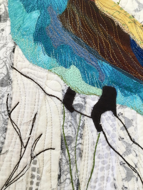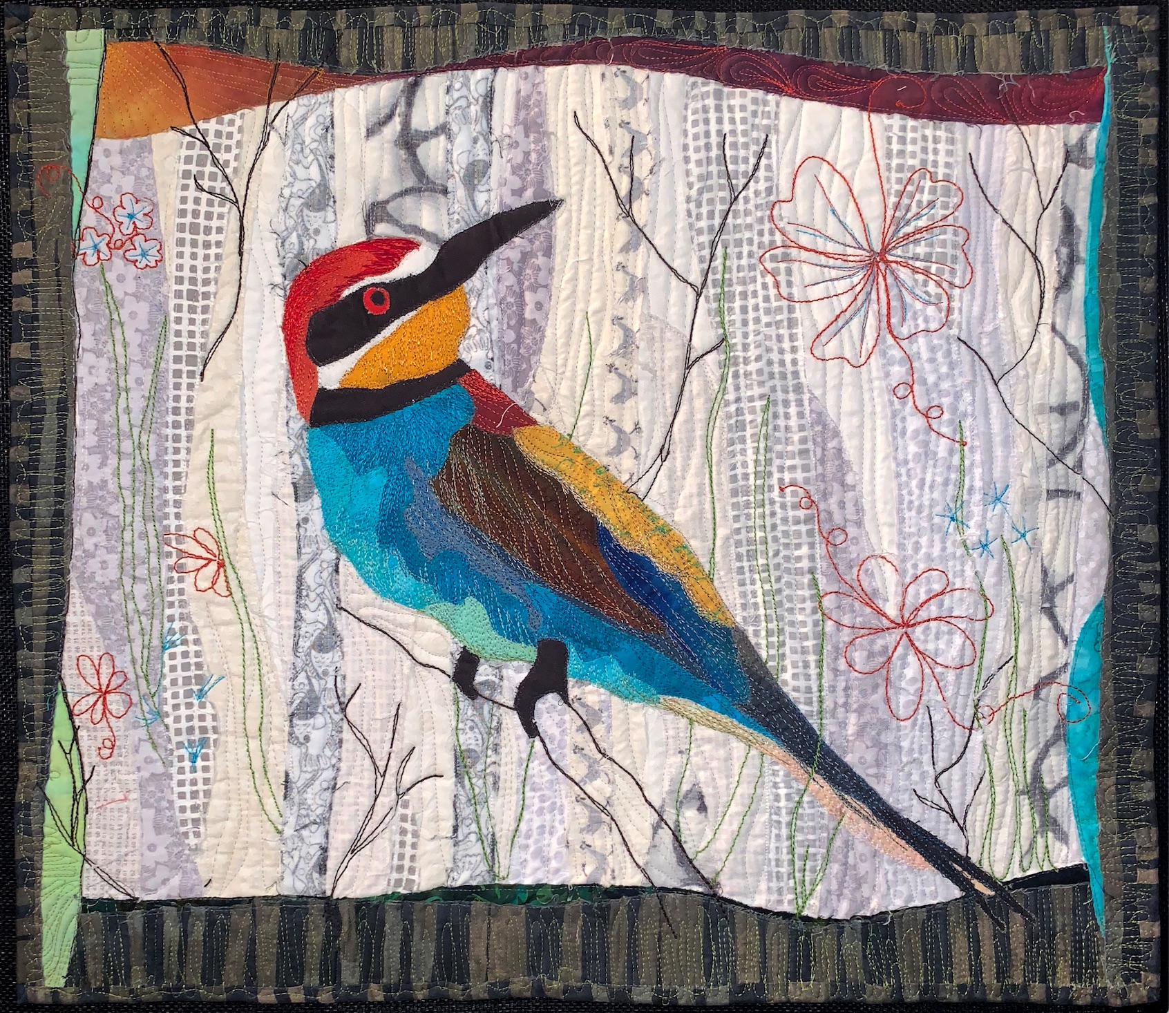 My partner, Inna told me she loves all kinds of quilts but she shared wonderful photos of her work and I knew she loved and excelled at traditional patchwork. –I too love all kinds of quilts, but decided to make Inna something she might not make herself. I chose my subject after I learned Inna lived in the Black Forest in Germany. When I researched the area I discovered that the Mediterranean Bee Eater, surprisingly, is found there. I think it is one of the most colorful and beautiful birds I’ve ever seen. Over the course of the year we sent messages back and forth (thank you Google Translator!). Inna’s exuberance and enthusiasm for making quilts just made me happy! I thought this bright colorful bird reflected her passion for quilting. We agreed we would both feel “withdrawal” if we don’t get to sew every day. Like all quilters we both love fabric. I wanted to use some of the special hand dyes that I’ve saved for years. But I also got a kick out of combining my semi solid fabric “paints” with the white and gray prints I could find in my stash. We both love to sew by machine and this quilt is entirely machine made. My choices were often inspired by techniques I have seen on The Quilt Show. I used raw edge improvisational applique for the background, lots of free machine stitching, and outline sketches with 12 wt. quilting thread.