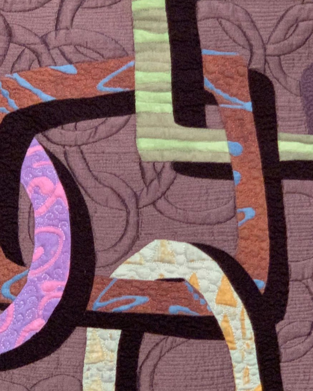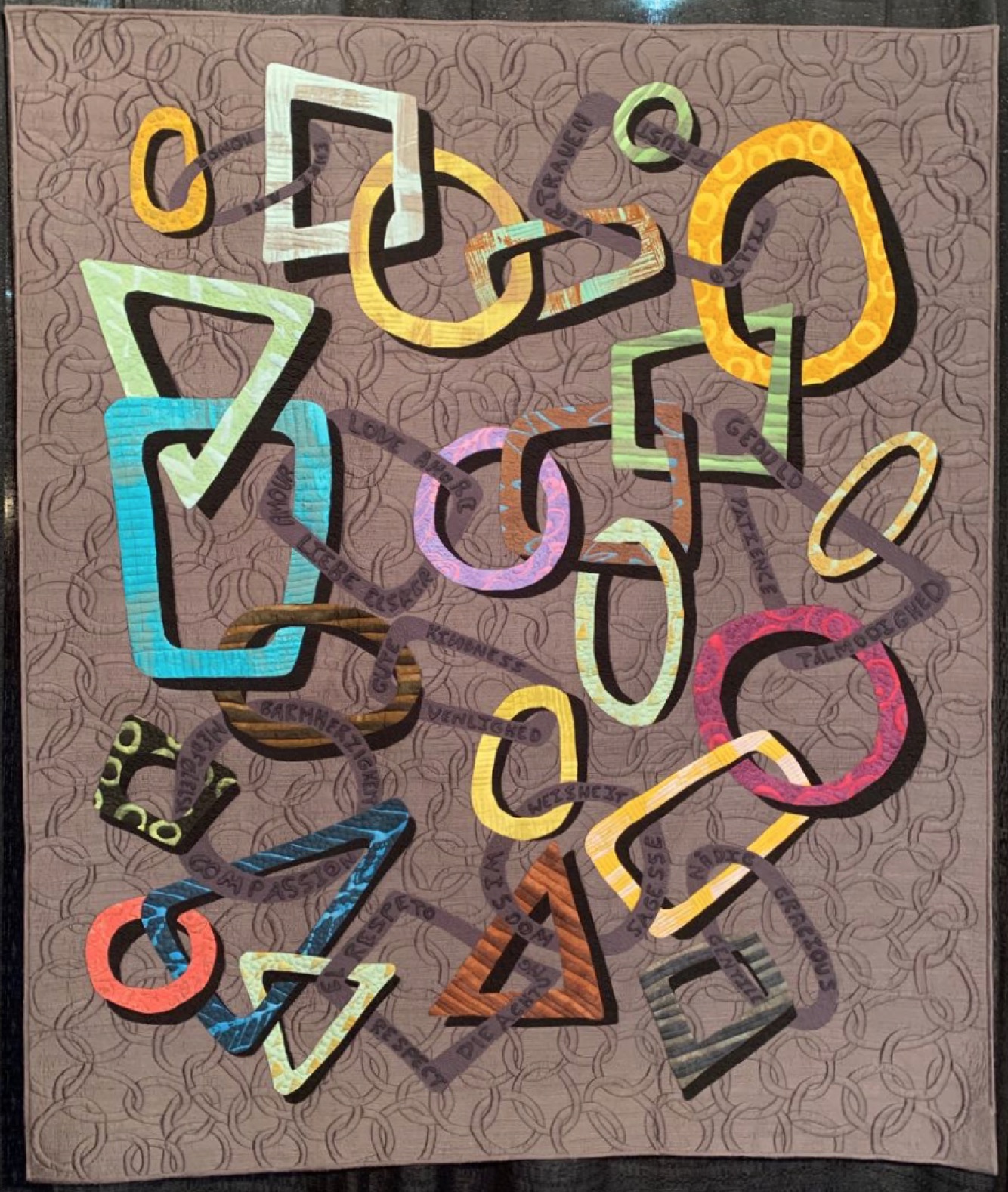 United was created using silk, cotton, and wool and was on display at the Houston International Quilt Festival as part of the Abstract, Small exhibition.