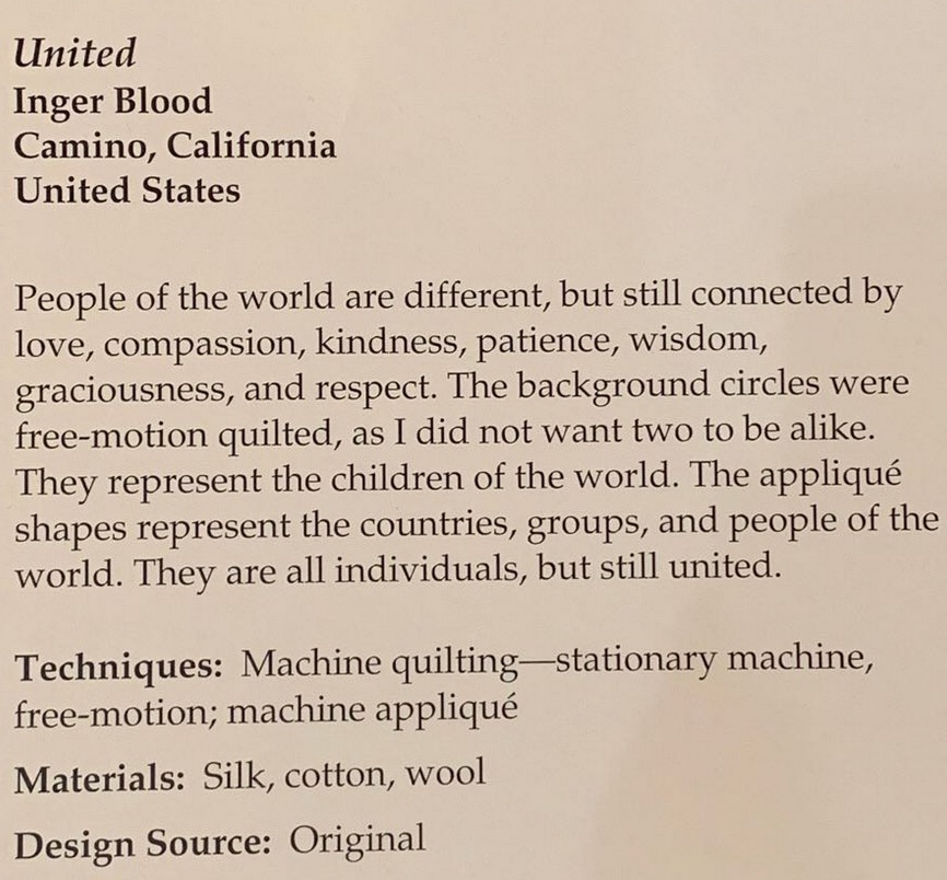 We found Inger's quilt, United, quite intriguing in how the quilting design echoed the appliqué design. She free-motioned the background quilting as she didn't want any two of the designs to be alike. Read the sign to find out why she did this.
