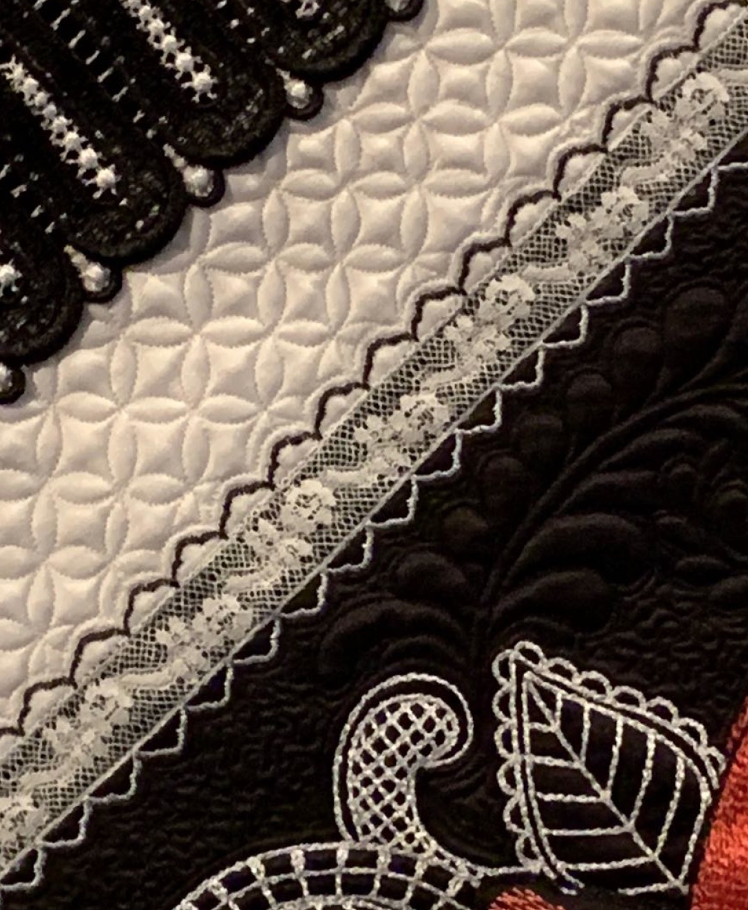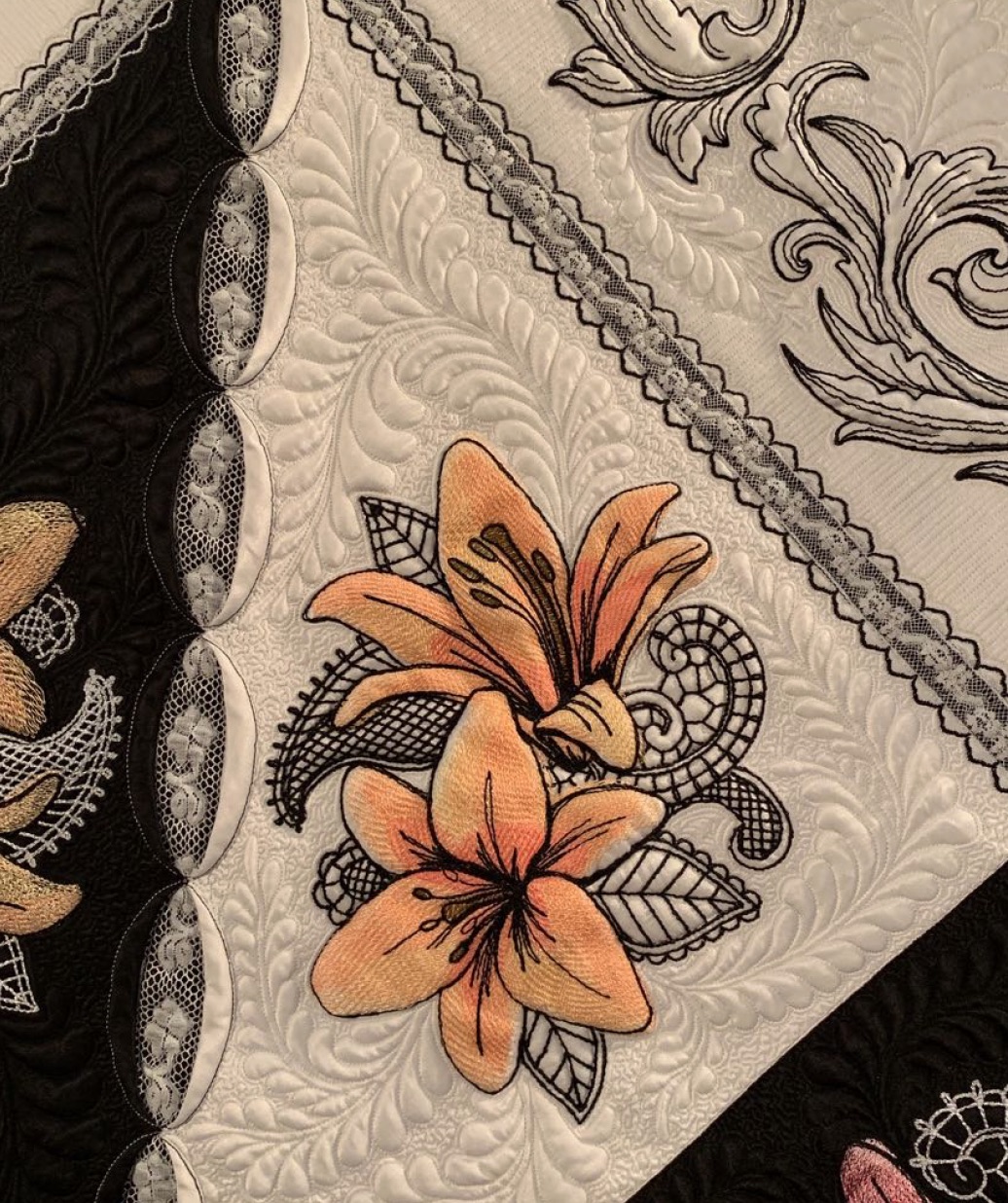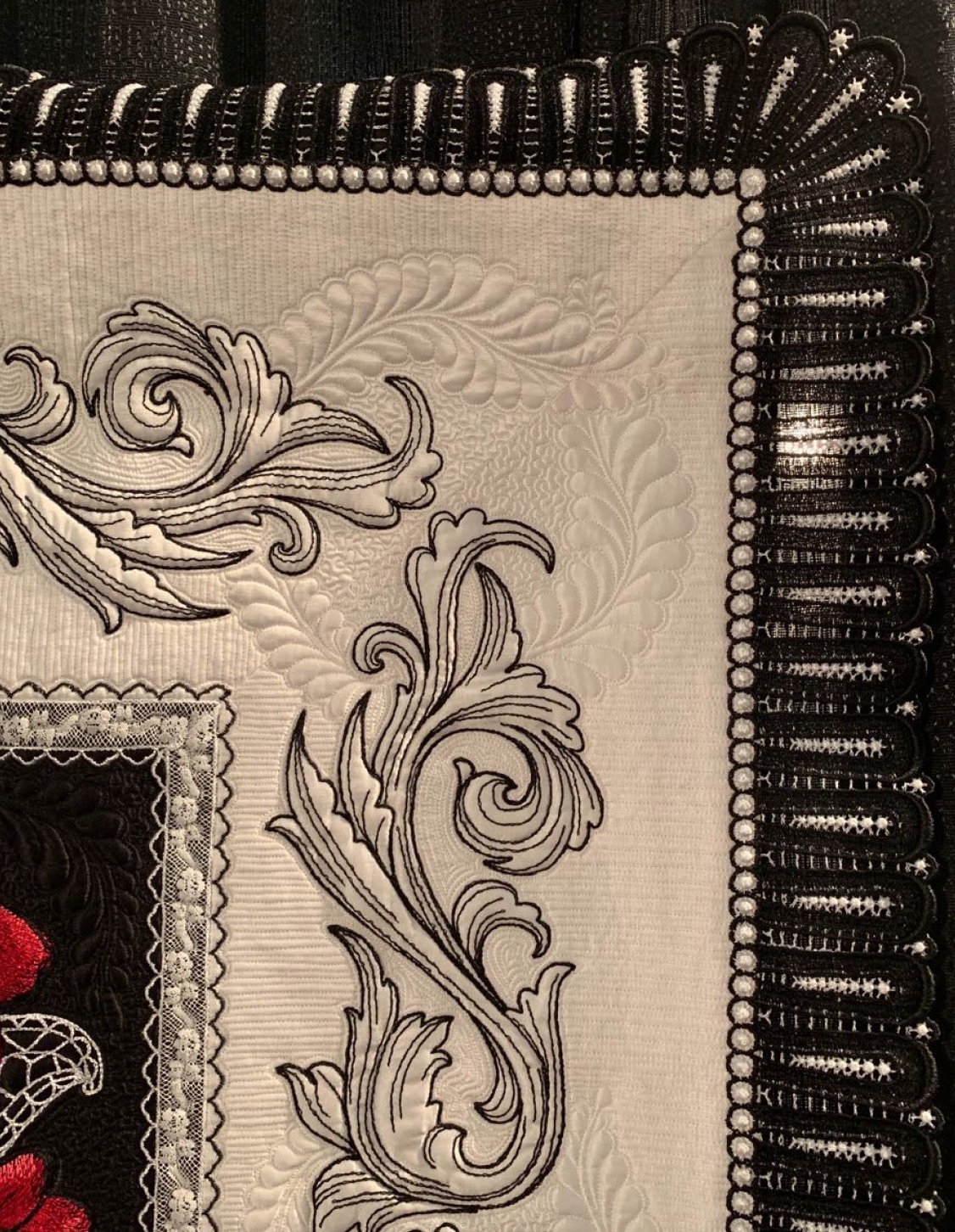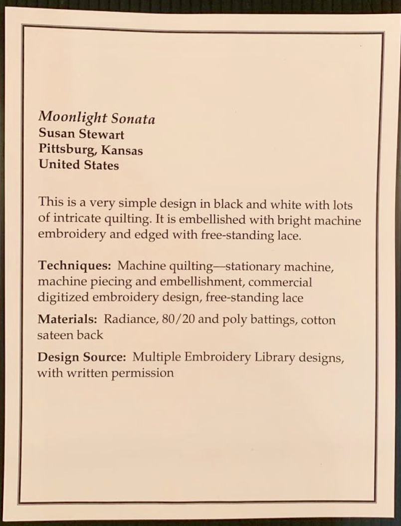 Susan calls her quilt, Moonlight Sonata, a "very simple design in black and white with lots of intricate quilting." Well, we have to agree about the quilting, but we are not so sure how simple it is. This elegant quilt also features machine embroidery and free-standing lace. And, we are still trying to figure out how she did the trim/binding on the quilt. Here are lots of photos for you to enjoy.