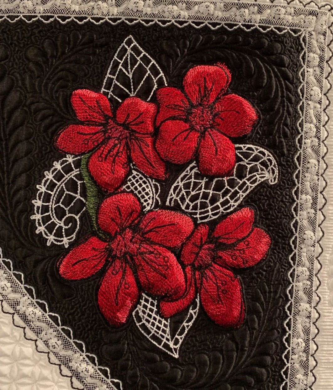 The black stitching around the flowers surely gives a wonderful dimension to them.