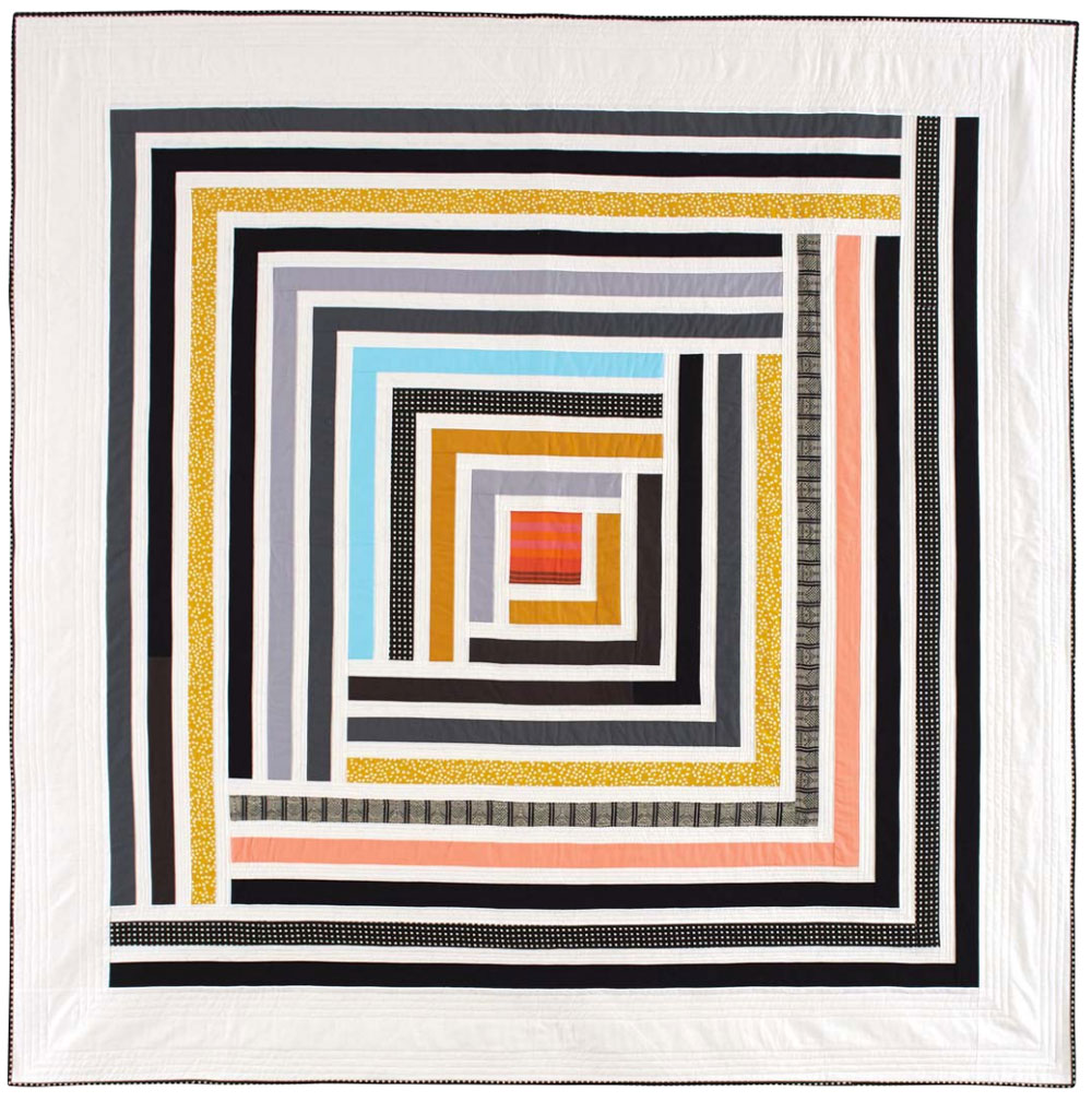 Suzy's background is as a traditional quilter. In Campfire, she took a simple log cabin block and exploded it to a larger size using negative space.