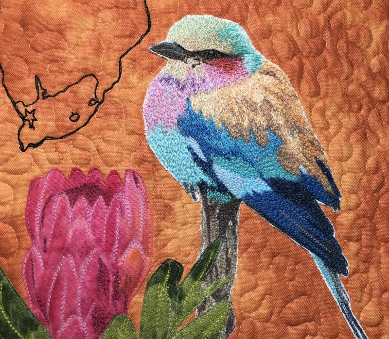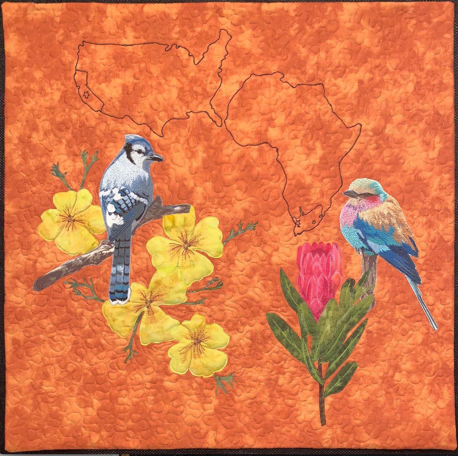 I created this IMQE Exchange Quilt for Wena LeRoux who lives in Malmesburg South Africa. My quilt is called "Two Birds of A Feather" and was created because of our similarities in our life styles. We have so much in common even though we are miles apart. I thought that if we were birds we could fly to meet one another and make it an even smaller world in which we live in. We both were raised on a family farm, we love horses, wine, quilting and our grandchildren. We have had similar tragedies in our lives, Wena was in a serious car accident and I went through Breast Cancer. In my quilt for Wena I chose to emphasize our Continents and the location of where each of us lives on the West Coasts. I live on the West Coast of the United States in California and Wena lives on the West Coast of South Africa. My State of California's flower is the "golden poppy" and a "Bluejay" is my favorite bird. Wena's National flower of South Africa is the "Protea" and the bird I chose for her is the "Lilac -breasted Roller" an African bird so beautiful and colorful like her quilts. The technique I used is thread painting and fused appliqué. I have thread painted the birds and outlined the Continents and Areas where we live, added fused and threaded flowers highlighted with inktense pencils.