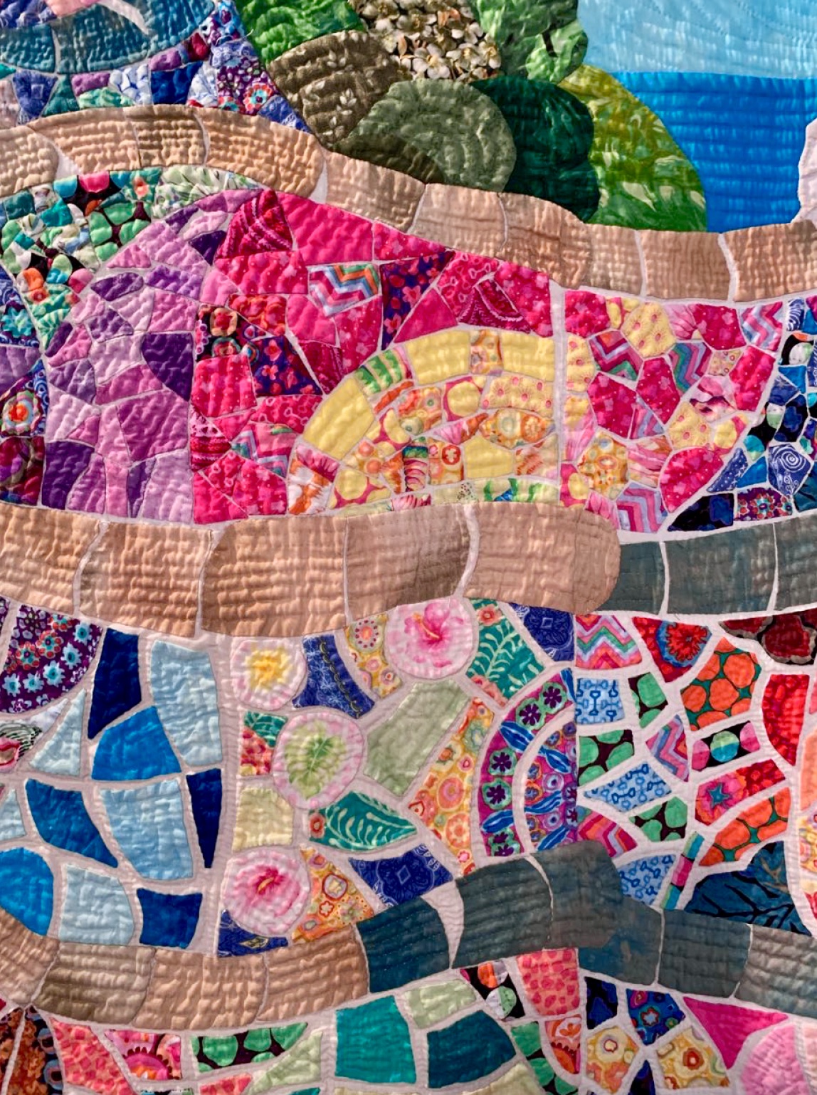 Aiko Saito did just that. Using textured fabrics and help from 11 friends, Aiko created The Beautiful Tiles of Park Güell. They used the fabrics to imitate the tiles in the park. Aiko suggests that you observe the quilt close up and then take a look back from afar to enjoy its beauty. The Park is in Barcelona, Spain and a picture of it is below the quilt pictures. It should now be on your bucket list to see the quilt and the park in person.