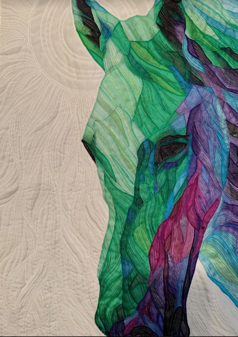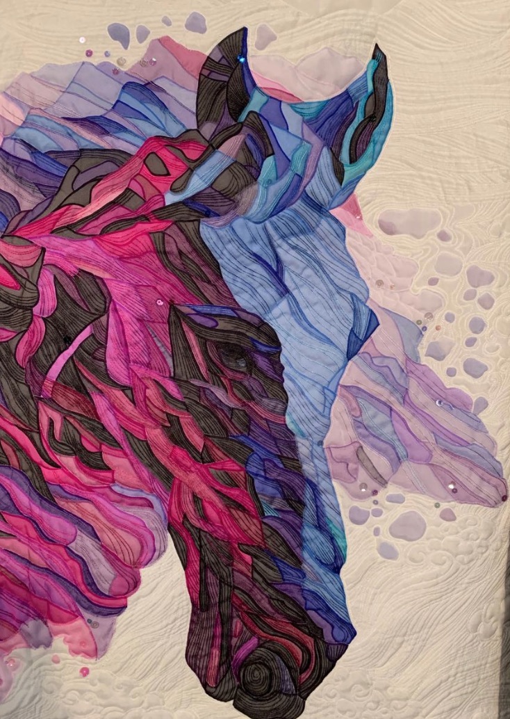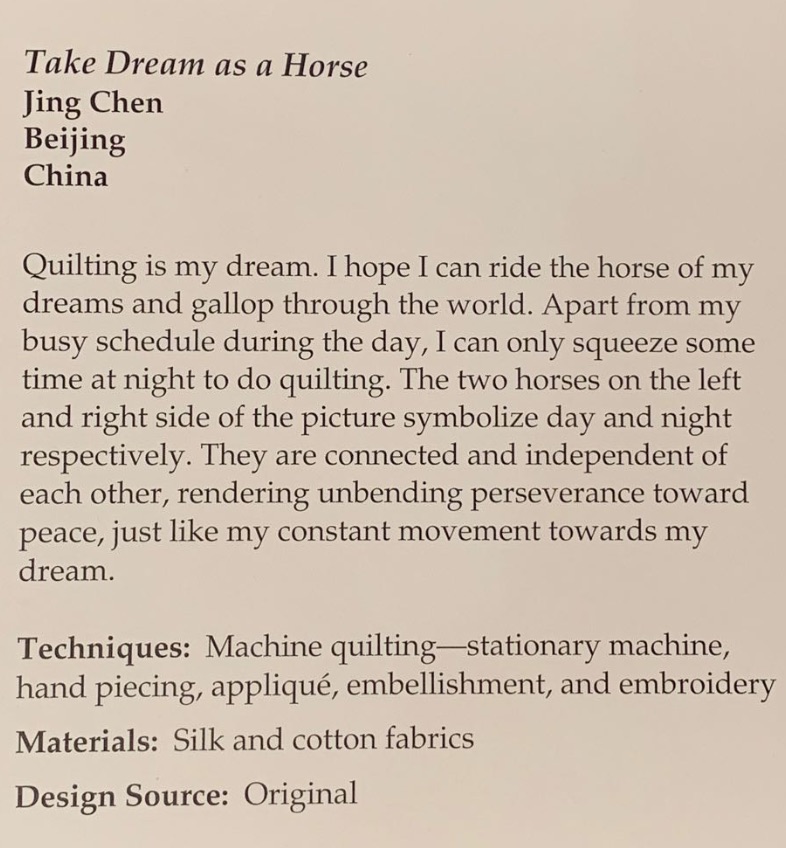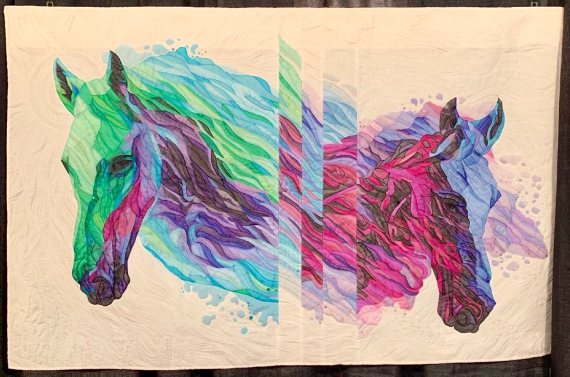 Take Dream as a Horse by Jing Chen of China is truly a dream of a quilt. Two stunning horses seem to appear out of a sea of watercolor. Hand pieced and machine quilted, Jing's quilt was on display as part of the Animal Kingdom exhibit at the Houston International Quilt Festival 2018.
