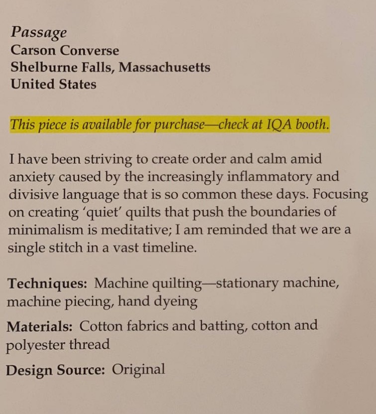 Passage was on display in the Abstract Small exhibit at the Houston International Quilt Festival 2018.
