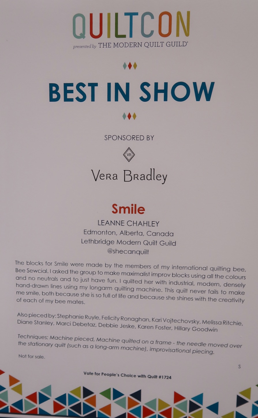 Smile by Leanne Chahley (and international friends) won Best in Show at QuiltCon 2019.