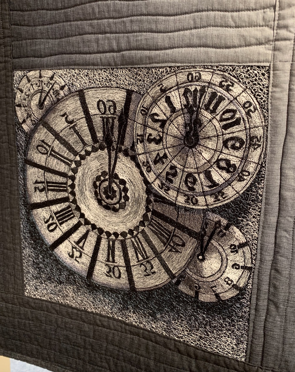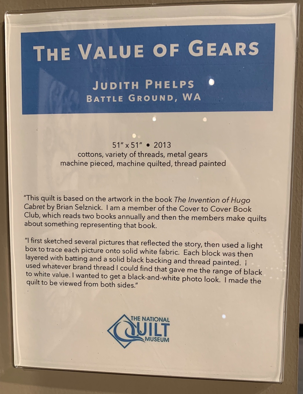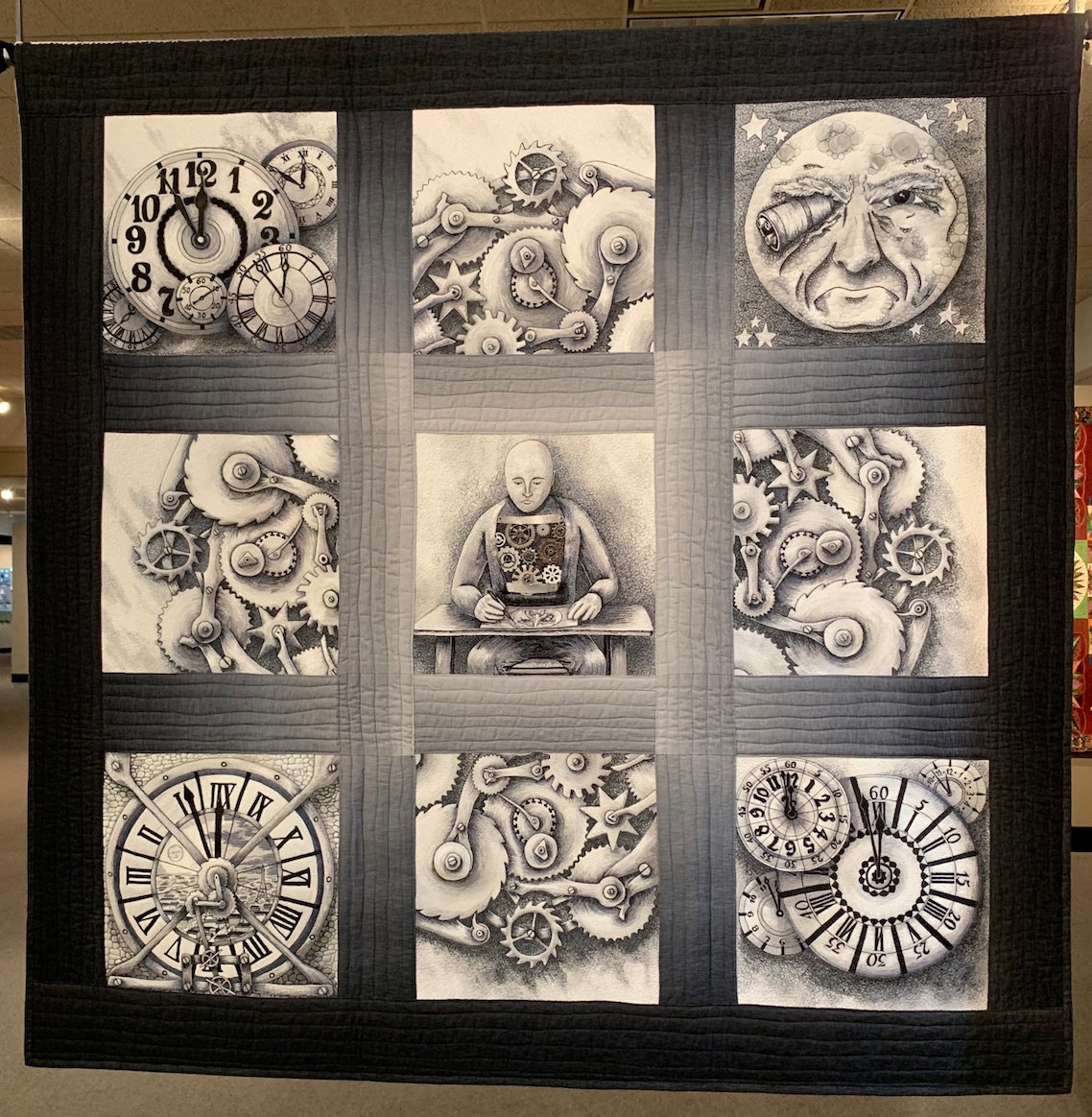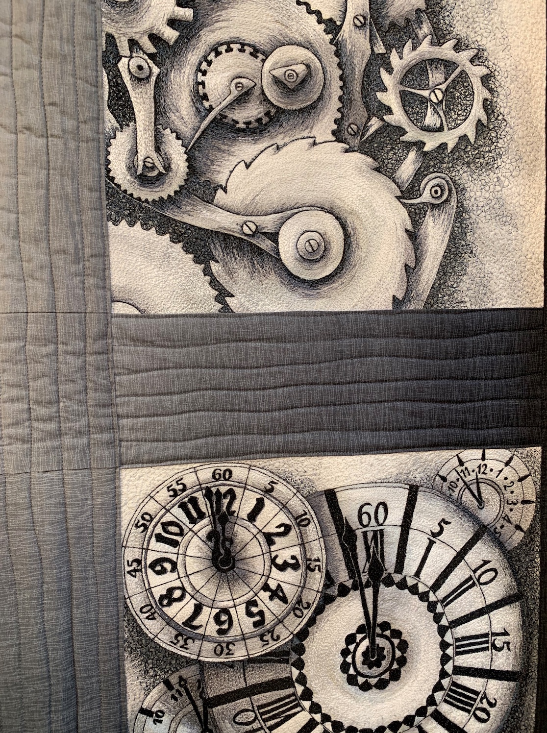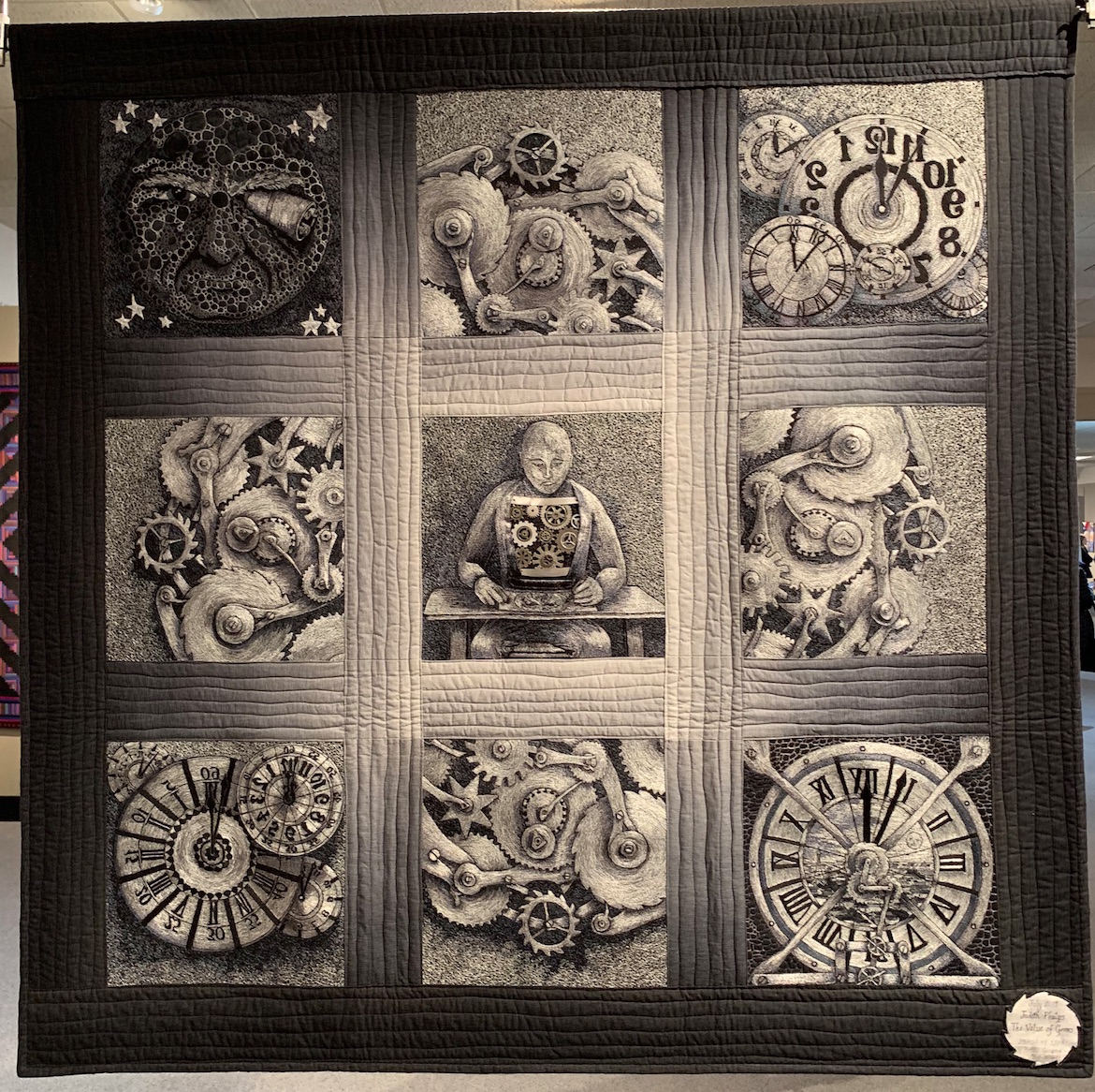 We found this stunning threadwork masterpiece, The Value of Gears by Judith Phelps, in the National Quilt Museum gallery. Judith wanted the quilt to read like black and white photographs, and only used different values of thread to achieve the effect. It's even more amazing in that it is meant to be seen both from the front and the back. When the pictures are backwards, you are seeing the back of the quilt.