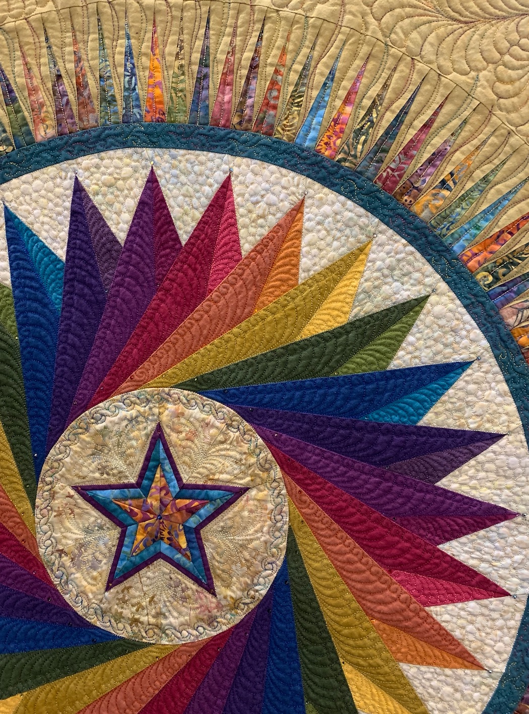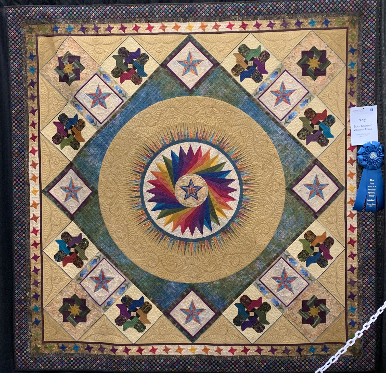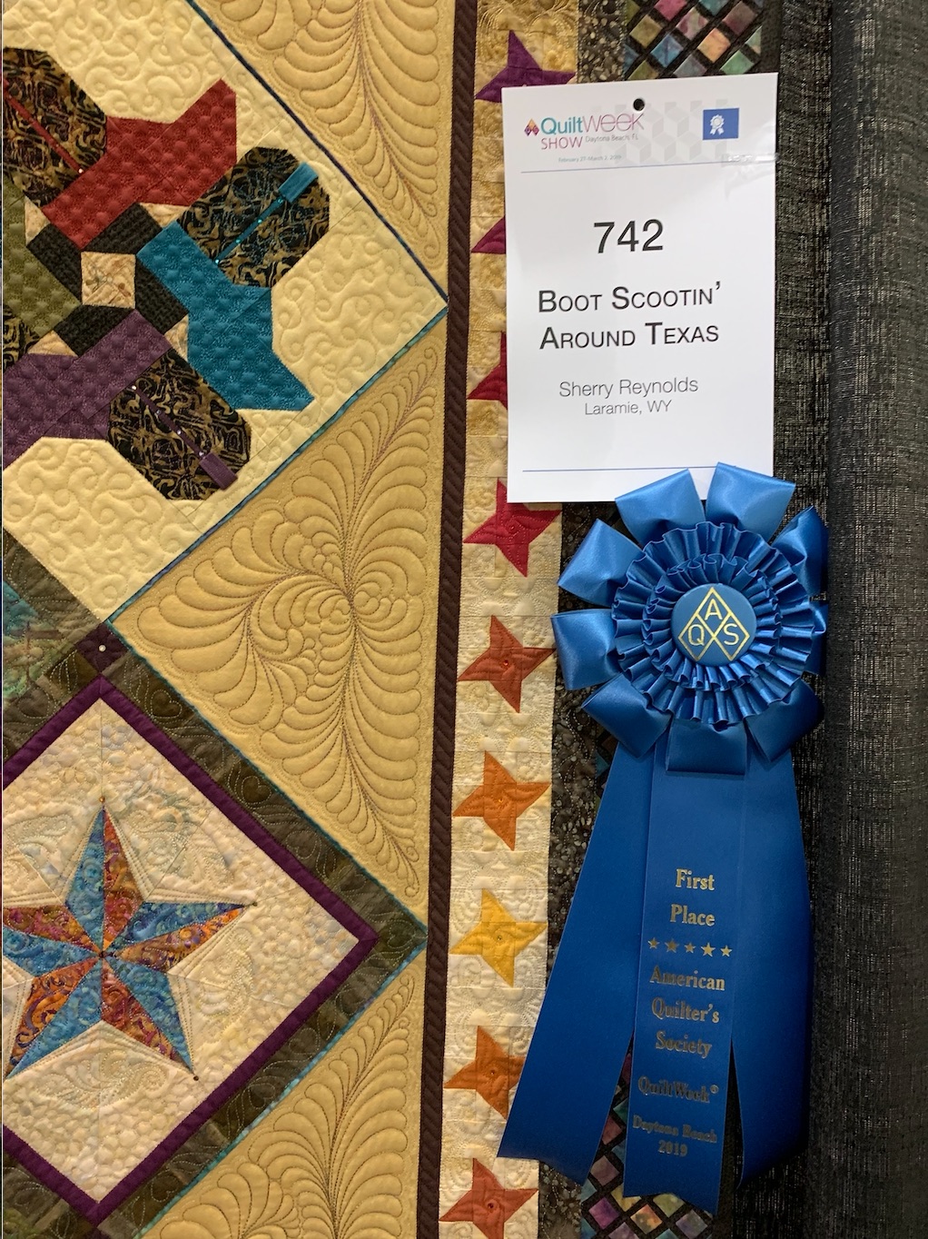 Multiple Best of Show winner Sherri Reynolds has a new quilt, and it just won a ribbon at AQS Daytona Beach 2019. Boot Scootin' Around Texas won Wall Quilts -- 1st Entry in an AQS Daytona Beach Quilt Contest.