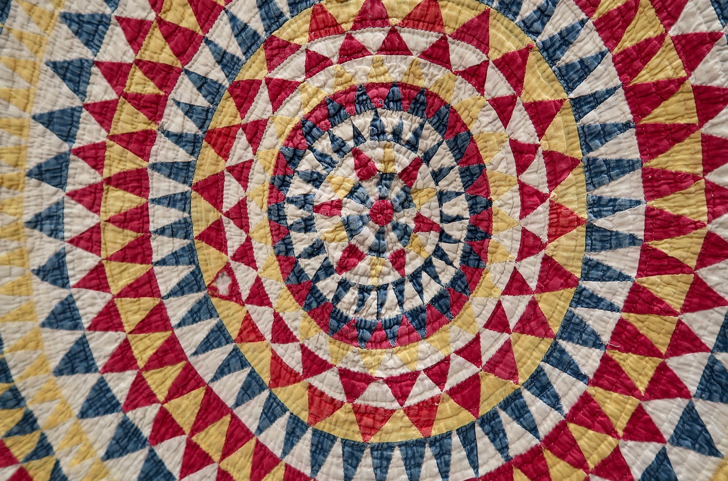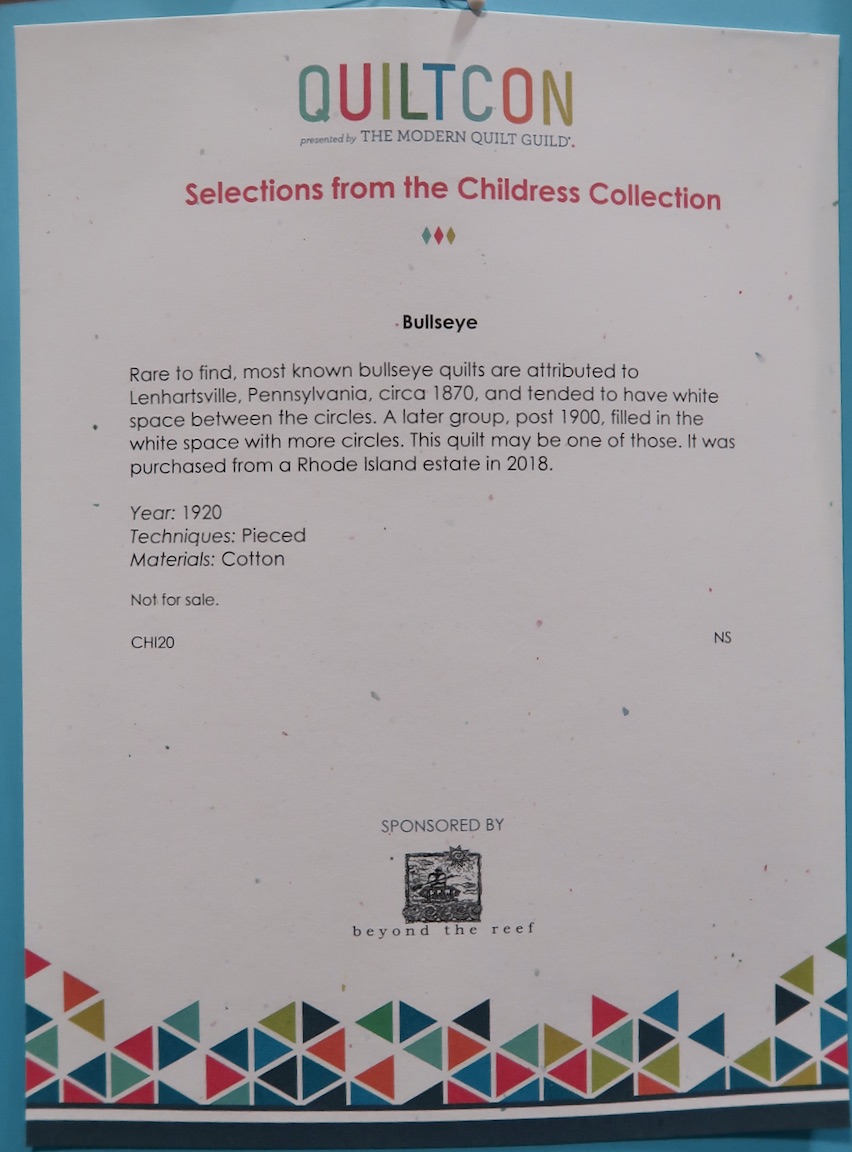 A portion of the Childress Collection was on display at QuiltCon 2019. One of the more stunning pieces was this rare, antique Bullseye quilt. According to the curator, most known Bullseye quilts are attributed to Lenhartsville, PA, circa 1870, and tended to have white space between the circles. A later group, post 1900, filled in the white space with more circles. This may be one of those quilts and is attributed to 1920.
