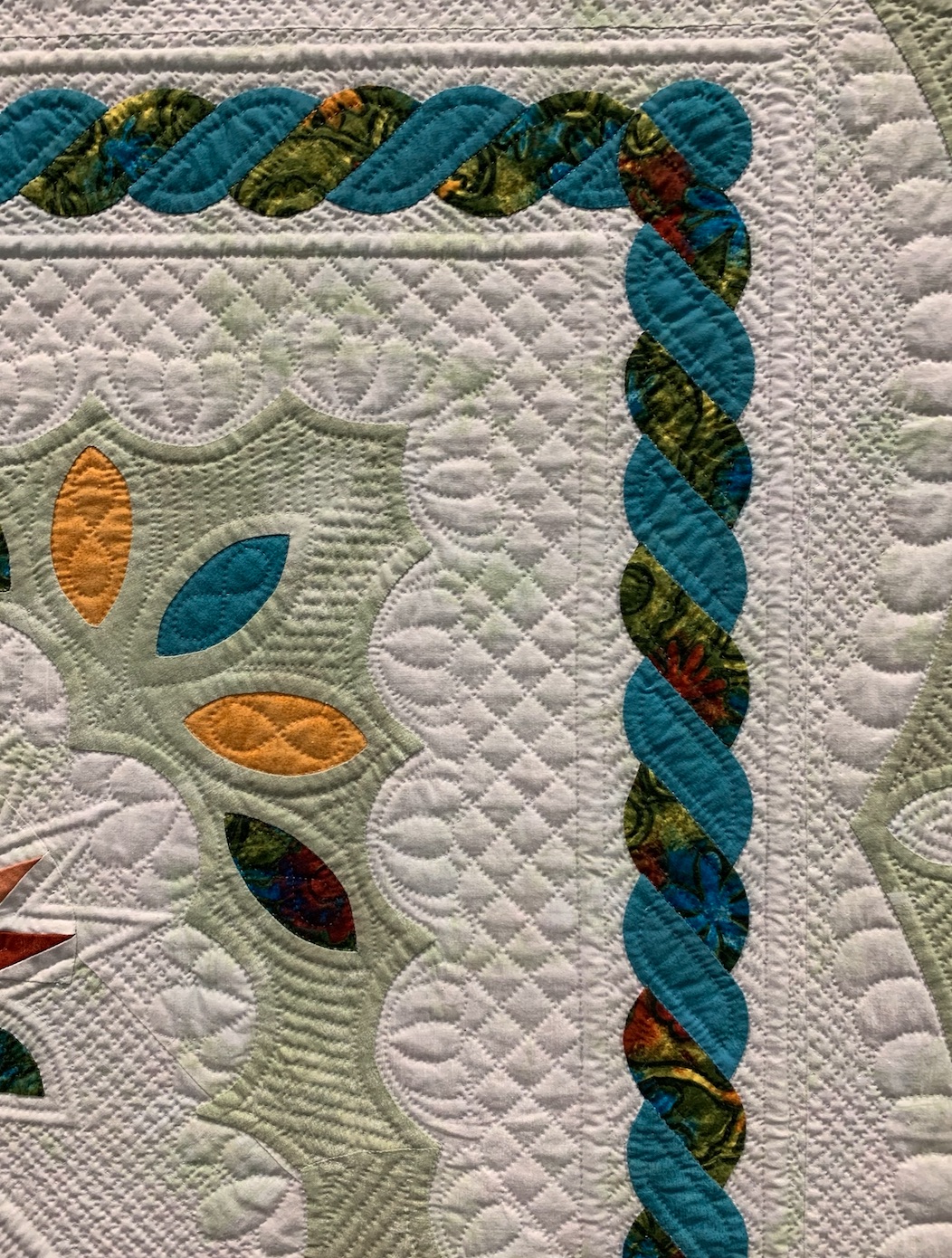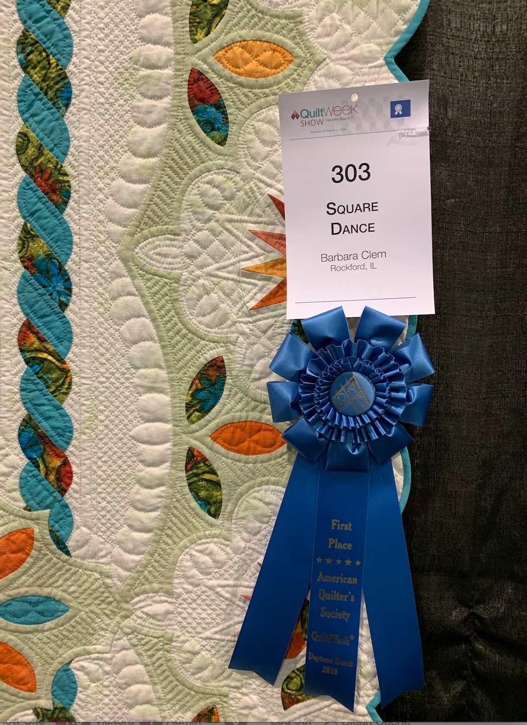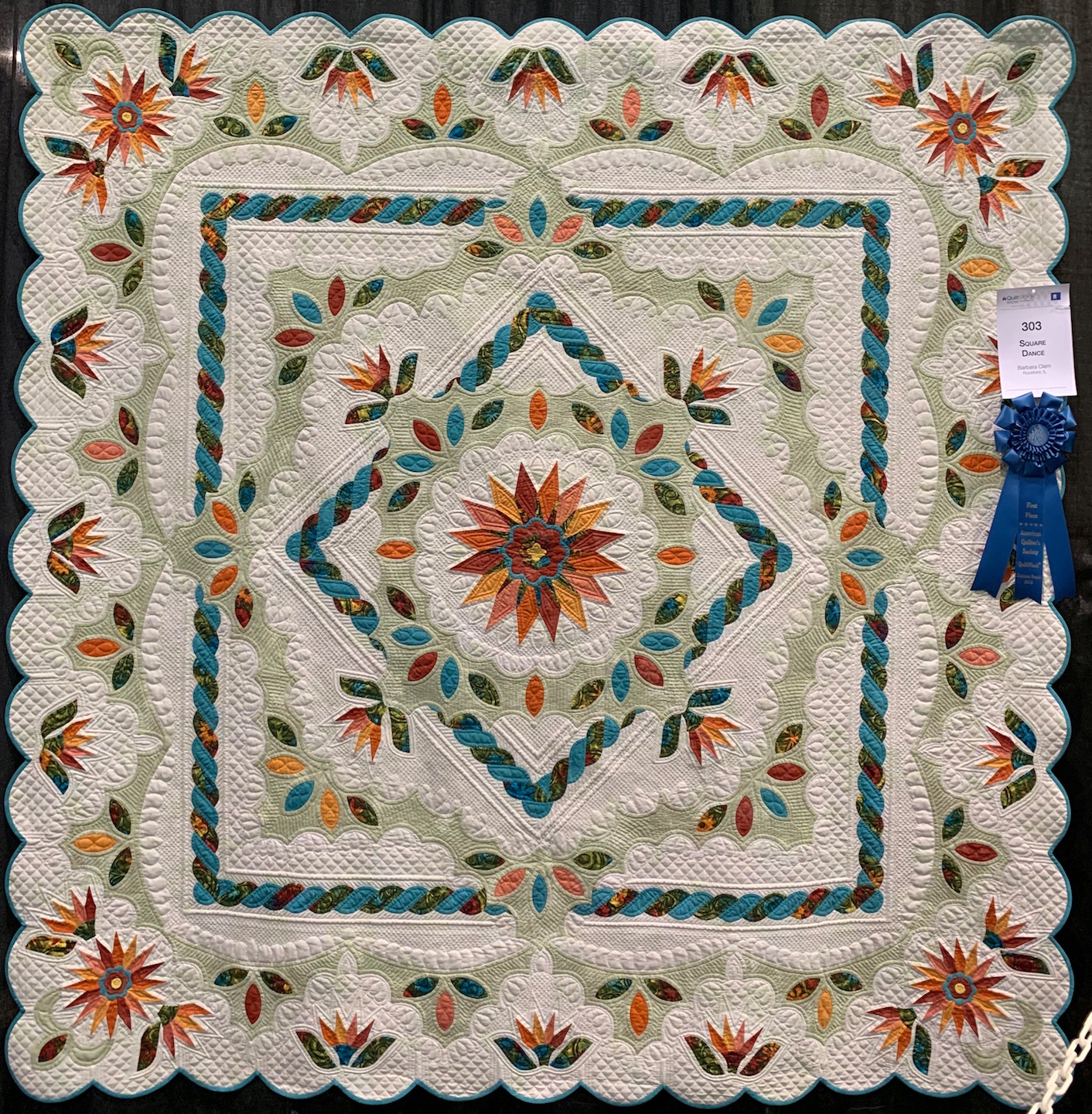The beauty of a hand-quilted quilt cannot be denied. Barbara Clem's, Square Dance, won 1st Place Hand Quilted Quilts at AQS Daytona Beach 2019 for a reason. Everything from the beautiful piecing to the scalloped border are highlighted by exquisite hand stitches.