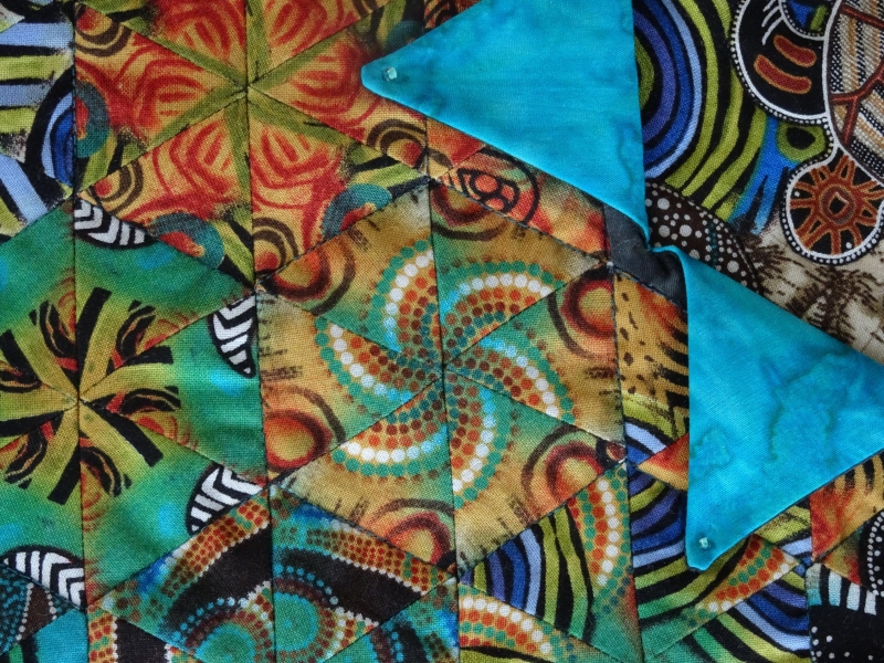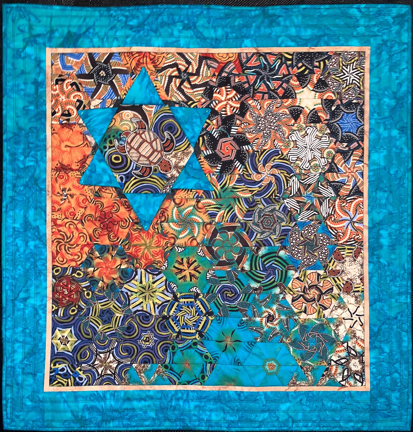 Separated by oceans and continents, time zones and hemispheres it’s surprising how much my quilt buddy, Kaye, and I have in common. In addition to our passion for quilting, we love sharing our skills with others. We both live by the water, enjoy time spent with our grandchildren and are both blessed with a sense of humour! We have exchanged numerous emails, shared images of our work, pictures of our family and lots of laughs! I am so happy to have Kaye as my friend! Kaye is an expert in “La Passacaglia” quilting and I decided that my quilt should be made from pieced blocks. Using Aboriginal designed fabric depicting turtles, I worked on an idea based upon the dreamtime story “WAYAMBA THE TURTLE” to illustrate our unique Australian culture. (The story is on the back of the quilt). I was inspired by Maxine Rosenthal’s book “One Block Wonders”, where each hexagonal block is unique. With careful cutting and freehand machine stitching, I made more than sixty 3-inch blocks from the one piece of fabric. I arranged the blocks in a colour and design sequence that would follow the story, beginning at the top right with blocks that represented the home camp, working clockwise to the billabong and the marshland where the women and children foraged for food. This flowed into the hunting ground and then the desert and finally the petal window showing the turtle in the creek.