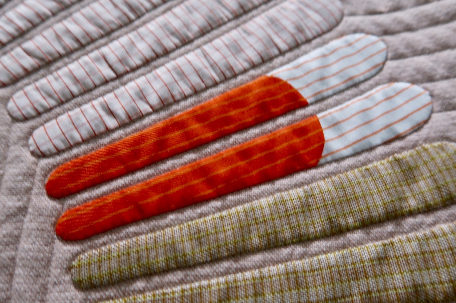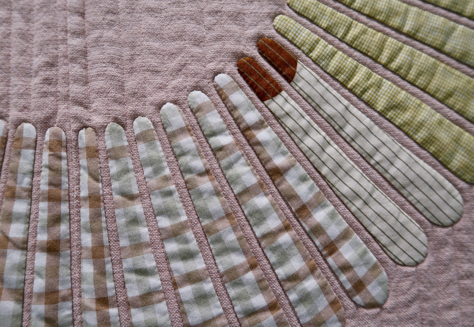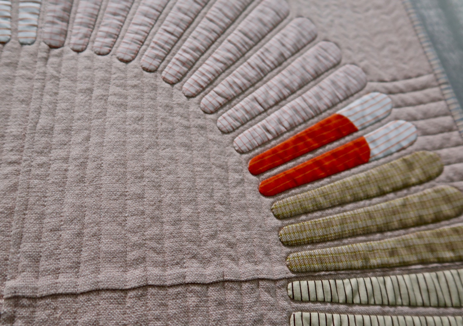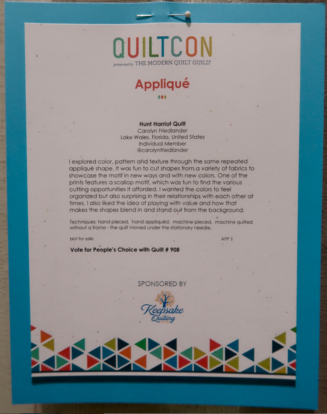 Carolyn Friedlander's beautiful quilt, Hunt Harriot Quilt, is an exploration of color, pattern, and texture through a repeated appliqué shape. It is hand pieced, hand appliquéd, machine pieced and machine quilted. Exquisite in its simplicity, Carolyn's quilt won 1st Place Appliqué at QuiltCon 2019.