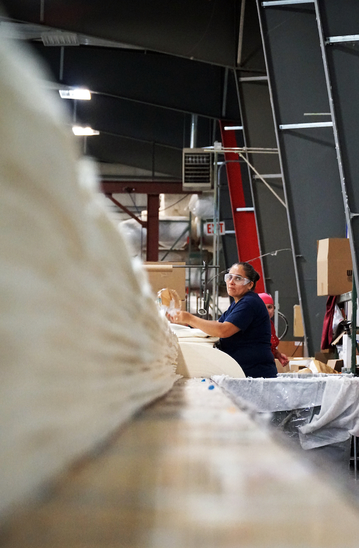 (Inside the Warm and Natural manufacturing facility in Elma, Washington, where every package of pre-cut cotton batting is folded by hand. Image courtesy of Teresa Duryea Wong)