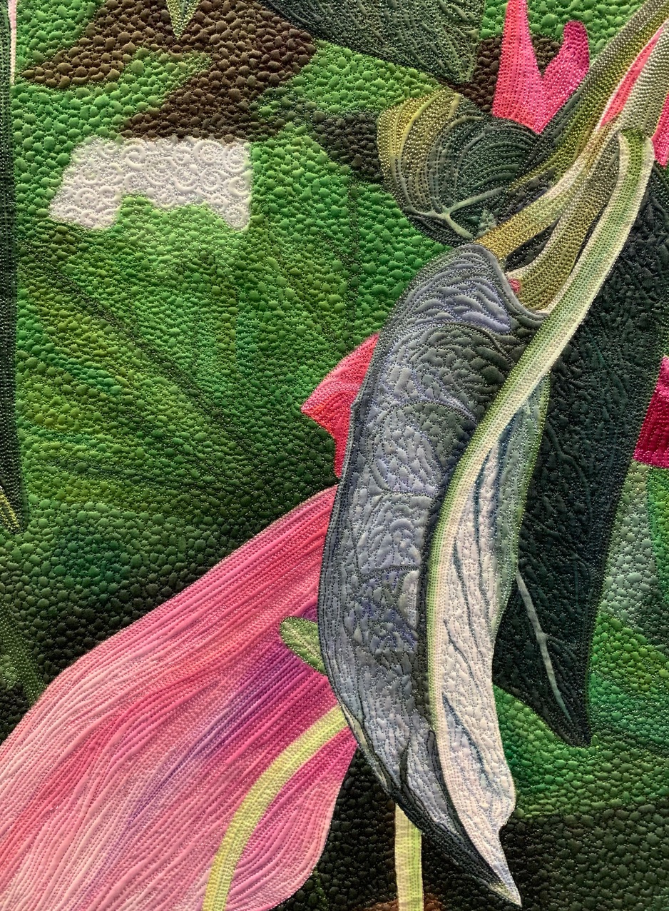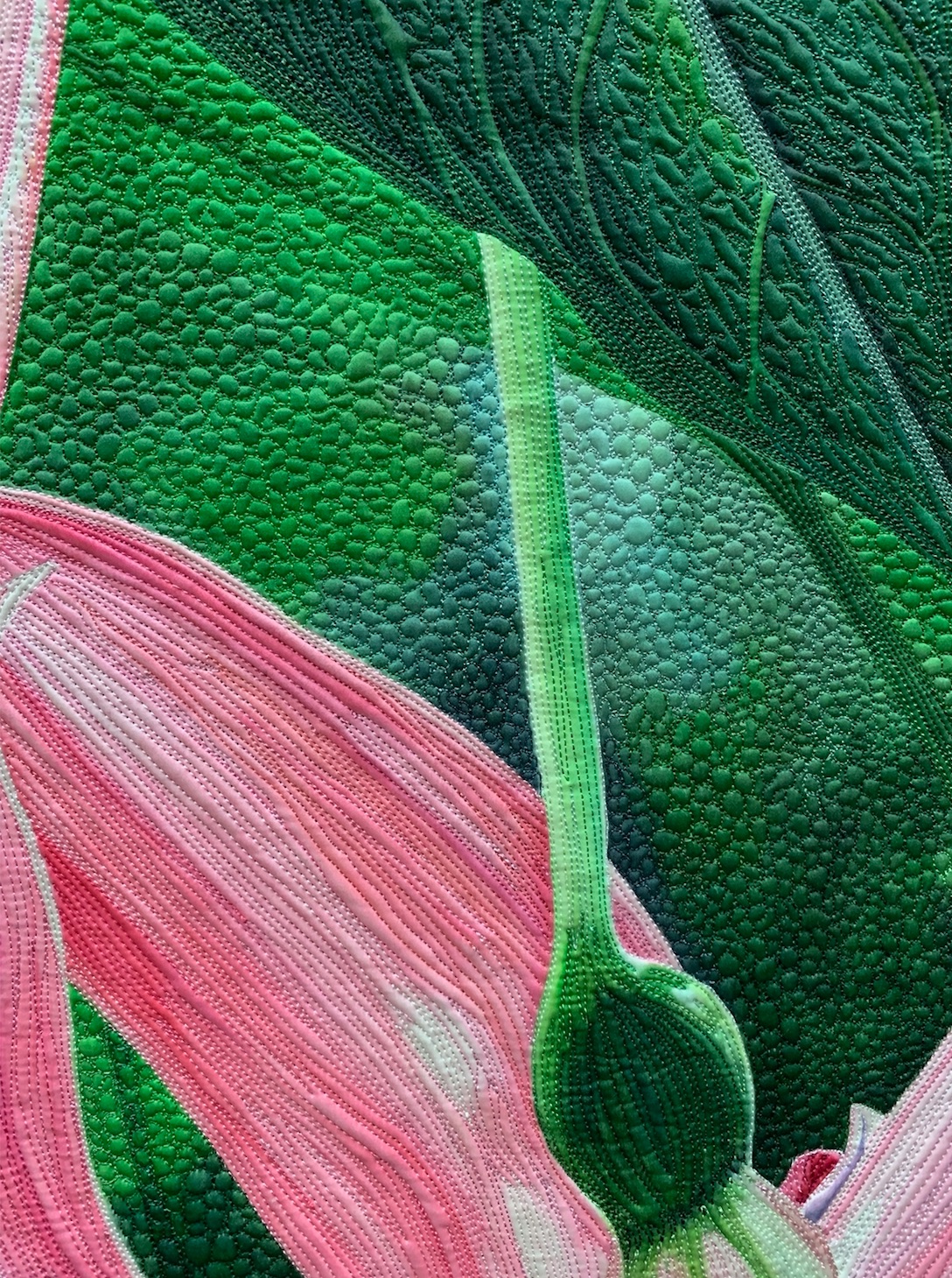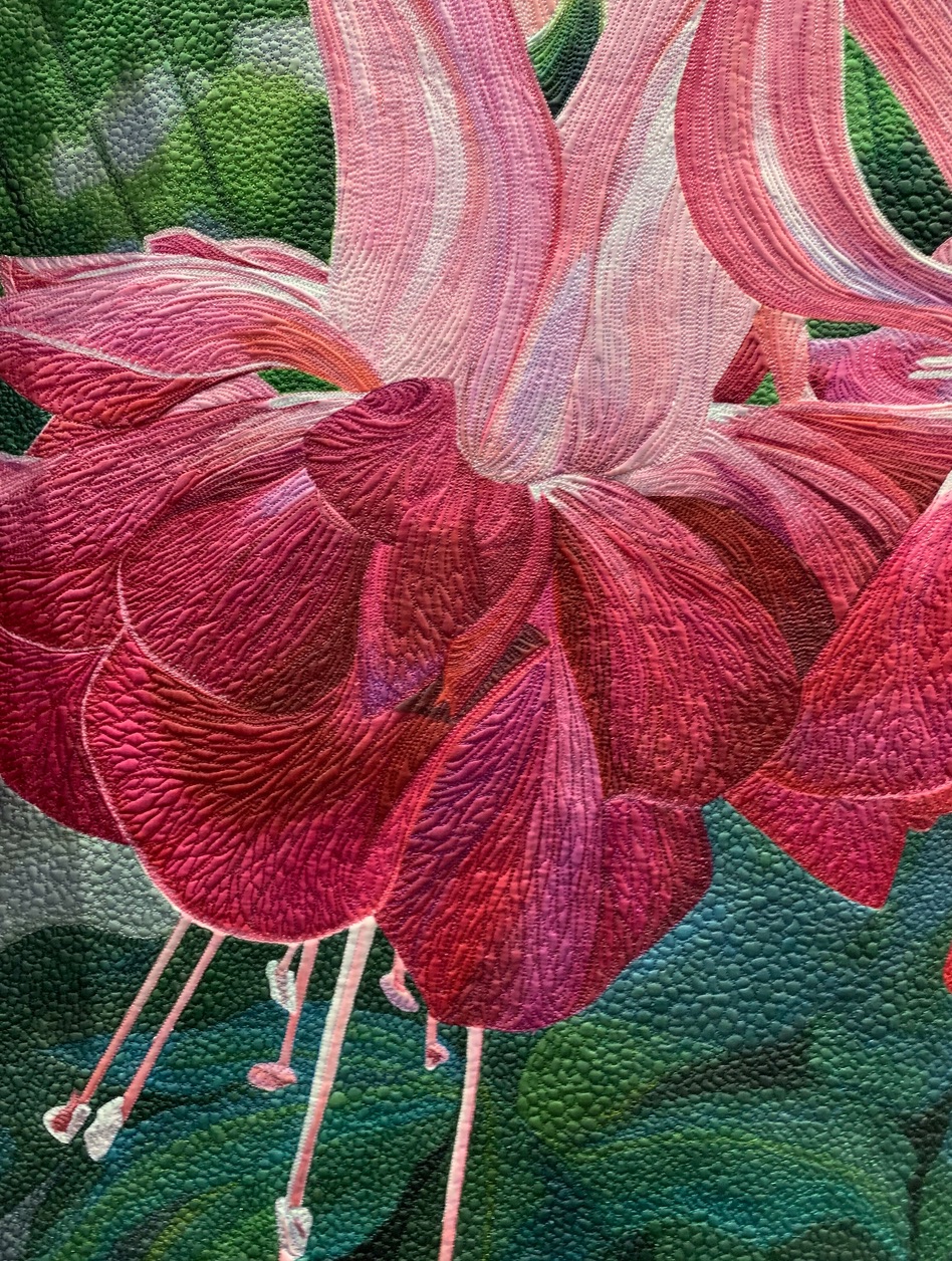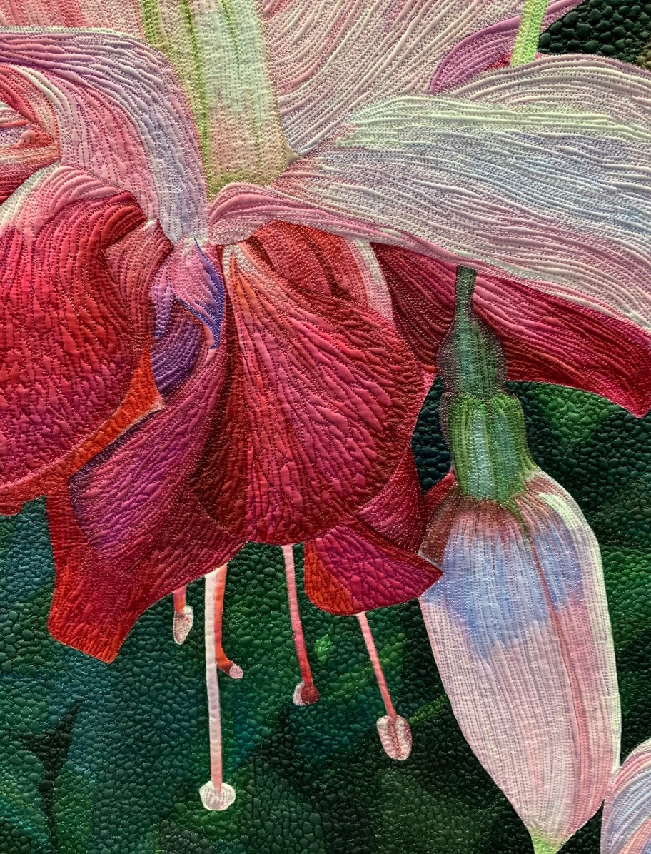 This quilt is dedicated to my Aunt Esther And Aunt Helen that left their earthly bounds within a month of each other last winter (2018). I needed to put my sadness somewhere so, I pulled out the fuchsia top that I had painted that previous summer and turned my sadness into joy. These fuchsia blossoms were at least 4-5" long and danced in the wind. While stitching, I thought of my aunties twirling around in a joyous dance. They are the Twirly Girls.