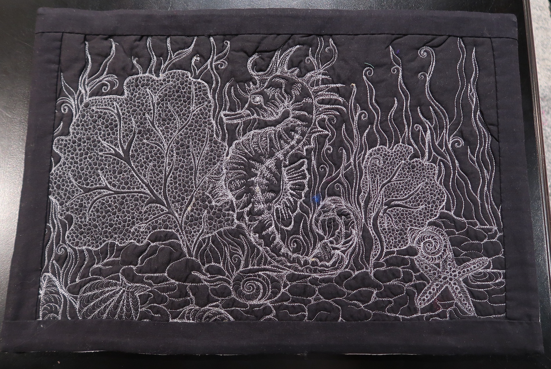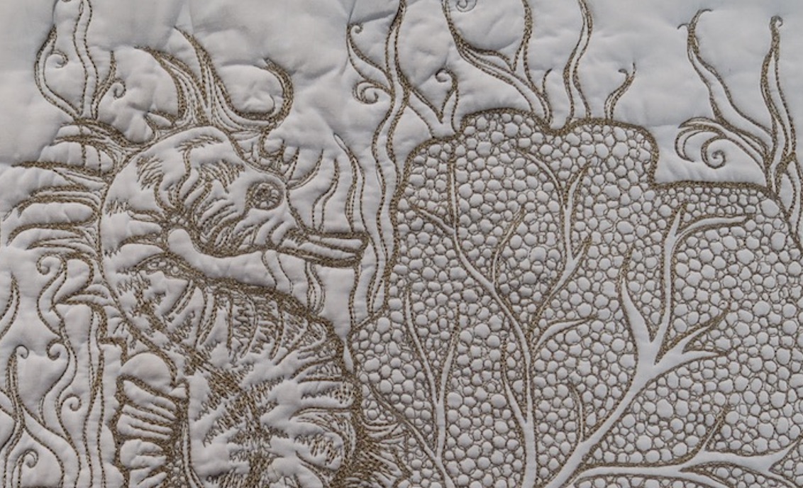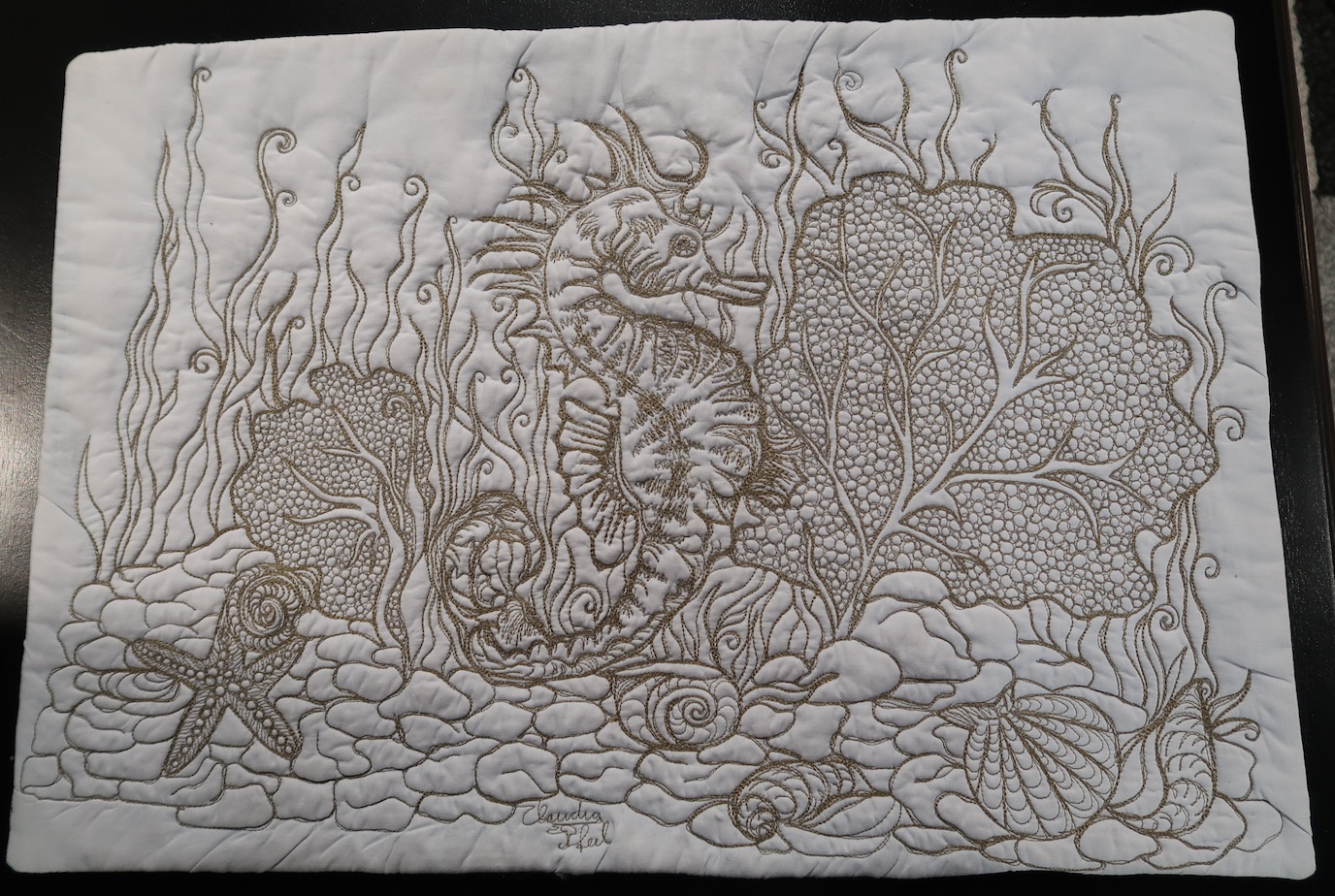 Claudia Pfeil recently visited the TQS set to tape a future show. While you might know her from her magnificent large quilts (think Fractal or Turtle Bay), she brought along this amazing, little, thread-painted piece. My Little Seahorse measures only 13.5" x 19.5" and is truly a machine quilting masterpiece.