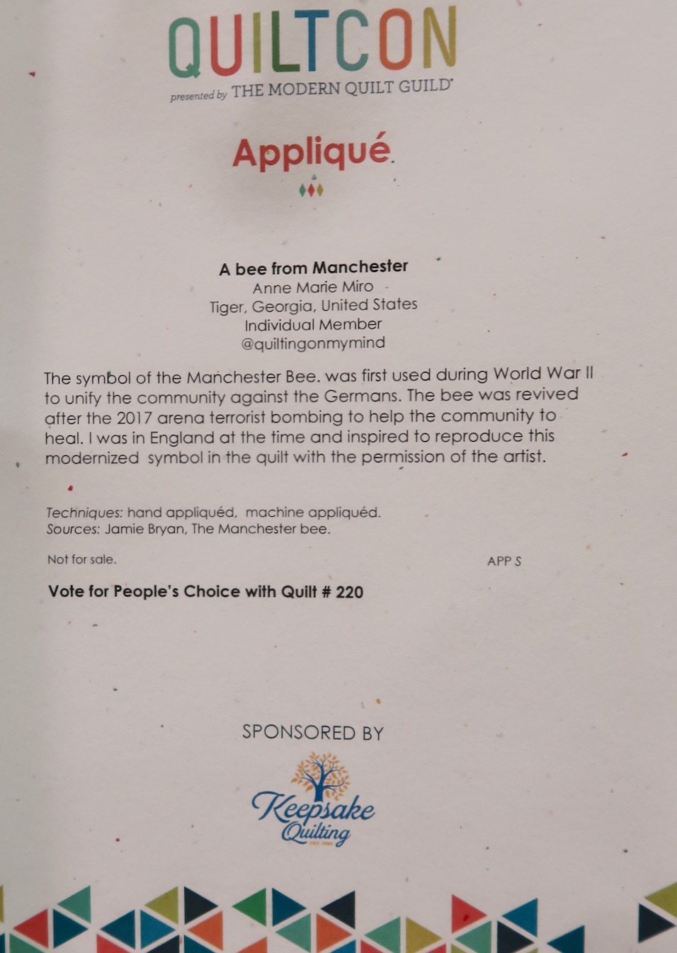 When we saw this quilt at QuiltCon 2019, we immediately thought of mosaic quilter Heidi Proffetty. While Heidi's first passion might be quilting, her other passion is beekeeping. As you know, bees play an important role in nature, but through history, they have also played an important role in providing community spirit and support. A bee from Manchester by Anne Marie Miro was her way of showing support for the Manchester community after the 2017 terrorist attack.