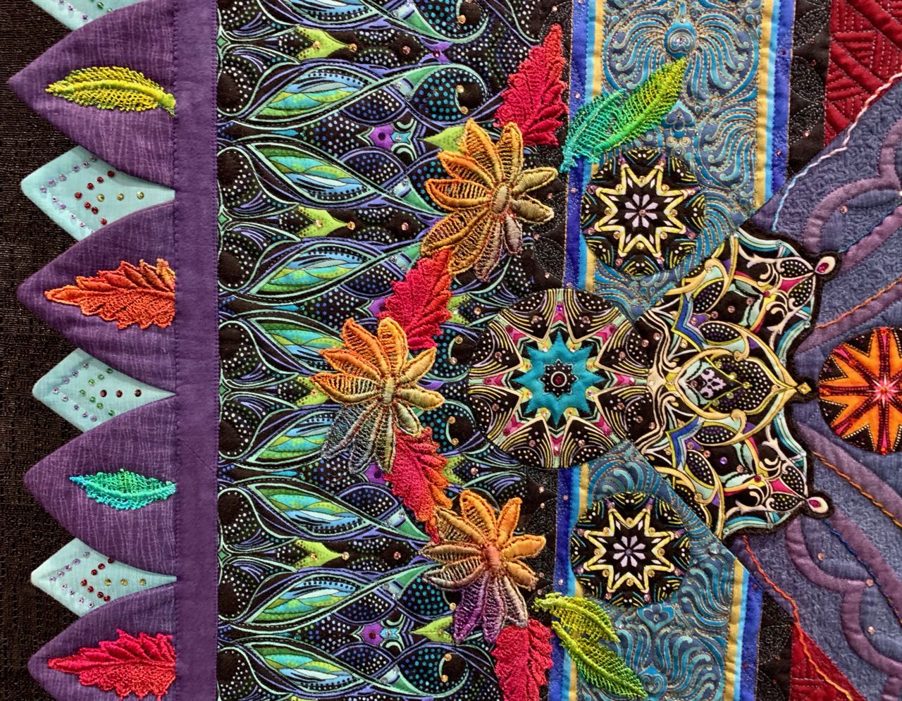 "Do you sell embellishments and crystals? Do you have a per ton price?" We haven't talked with Marilyn Badger yet, so we can't be sure she actually made this call, but we do know that this stunning quilt is 77" x 77" and includes Fused Appliqué, Hand Appliqué, Beading, Broderie Perse, Collage, (Lots of) Crystals, Embellishments, Hand Embroidery, Free-Motion quilting and Fabric Painting.