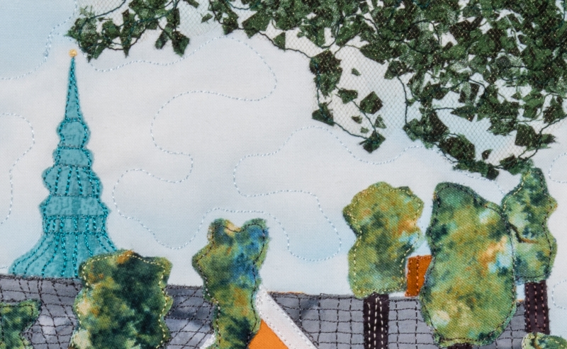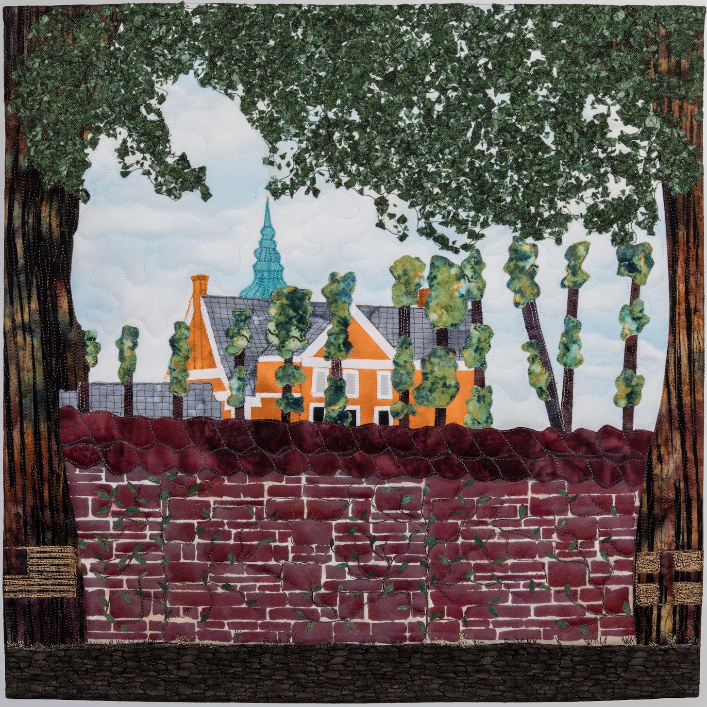 I was so fortunate as to be teamed up with the best partner I could ask for, Dawn Siden, a brilliant quilter and a very interesting person. Early on we figured out a theme and a size for our quilts. We’ve had some very interesting “talks” along the way, about quilting in particular and life in general. I wanted to make a quilt for Dawn, that would tell a story about my neighborhood and country (Denmark). I’ve chosen a sight from a used to be royal castle, I went and took lots of photos. I could have made the obvious choice, seeing the castle from the front, but I found it to be too tourist like. This view from the back of the castle, is what made my heart happy. I love making pictorial quilts, and using my own photos and often times using my own home dyed or painted fabrics. In this quilt I’ve stenciled the brickwall, using acrylic paints. The foliage is made of my home dyed fabrics. It’s all made as raw edge fusible applique, thread paintet and quiltet on my Bernina Q20. This challenge really shows, that where ever you are or whom you may be, with just one thing to share we can relate to each other and exchange respect, encouragement and recognition. What we all need in this world. In this case it’s quilting, it could be anything! Thank you TQS! Tina Sommer Paaske.