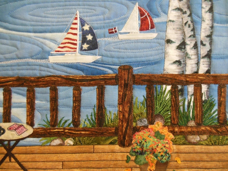 Home – Somers Bay, Montana My partner is from Denmark. I am from Montana. We were delighted to find out that we both were art quilters, and almost immediately decided to make a quilt depicting where we live. With that settled, we began to share wonderful stories of our lives, customs, and quilting. What I found sad was the fact that few ladies in her country buy another woman’s art quilts. Most are bought by men. Here in America we are always buying each other’s work any place we can. Another interesting fact is that the population of the US’s largest city, surpasses the population in all of Denmark. And, because of that, we have many more options and outlets for quilting. An example: I have 4 wonderful quilt shops within a half hour’s drive. One of our celebrated holidays is Halloween, which is the end of October. Denmark has a similar holiday, Fastelavn (carnival), when children dress in costume and may come to your door and sing for sweets. This celebration in Denmark happens in early spring, sometime before Ash Wednesday. I enjoyed making this quilt for my partner, and tried out a few new techniques. We had decided on a size early on, and once I was almost done, I realize we were too small, and did not comply with the size rule. So, I sliced and stretched the right side with the birch trees, and then added everything from the top deck rail on down. Whew!
