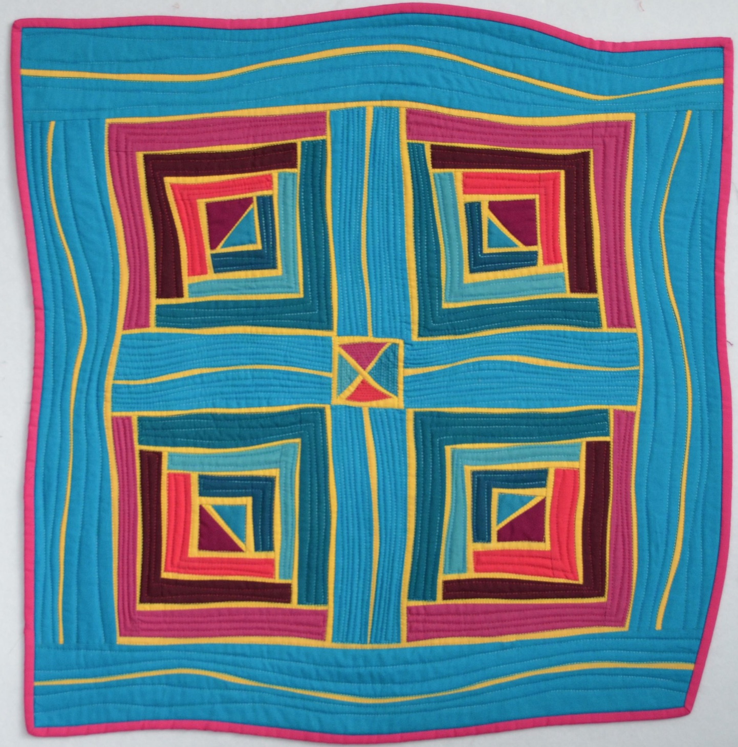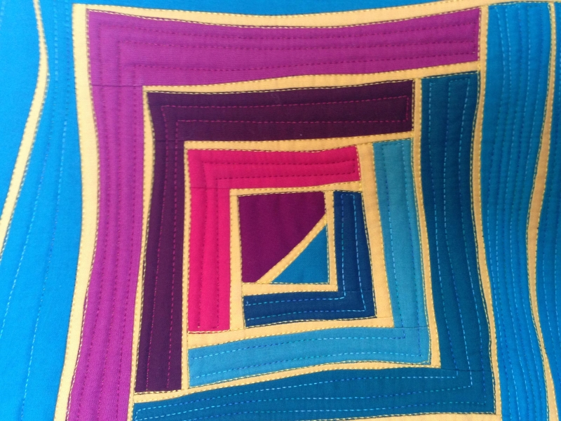 The IMQE has been a lot of fun for my partner and me. When I first learned that Maria Rosaria Roseo lived in Rome I was so excited! I love visiting Rome and how lucky was I to have a new friend that lived there! When Maria Rosaria showed me photos of her quilts and her work with the Roman School of Quilting, I was even more excited. Here was a quilter like me! Maria Rosaria and I agreed we didn’t want to do traditional miniatures. We are both followers of Jean Wells and her work. We decided to make each other a miniature quilt with the influence of Jean Wells. After reading through Jean’s book “Intuitive Color and Design” I decided a log cabin innovative pieced quilt was perfect for the IMQE challenge and for Maria Rosaria. I chose my fabrics, hues of primary colors and went to work! This was a fun quilt to make and I am honored to be able to give “To Rome With Love” to my friend, Maria Rosaria!