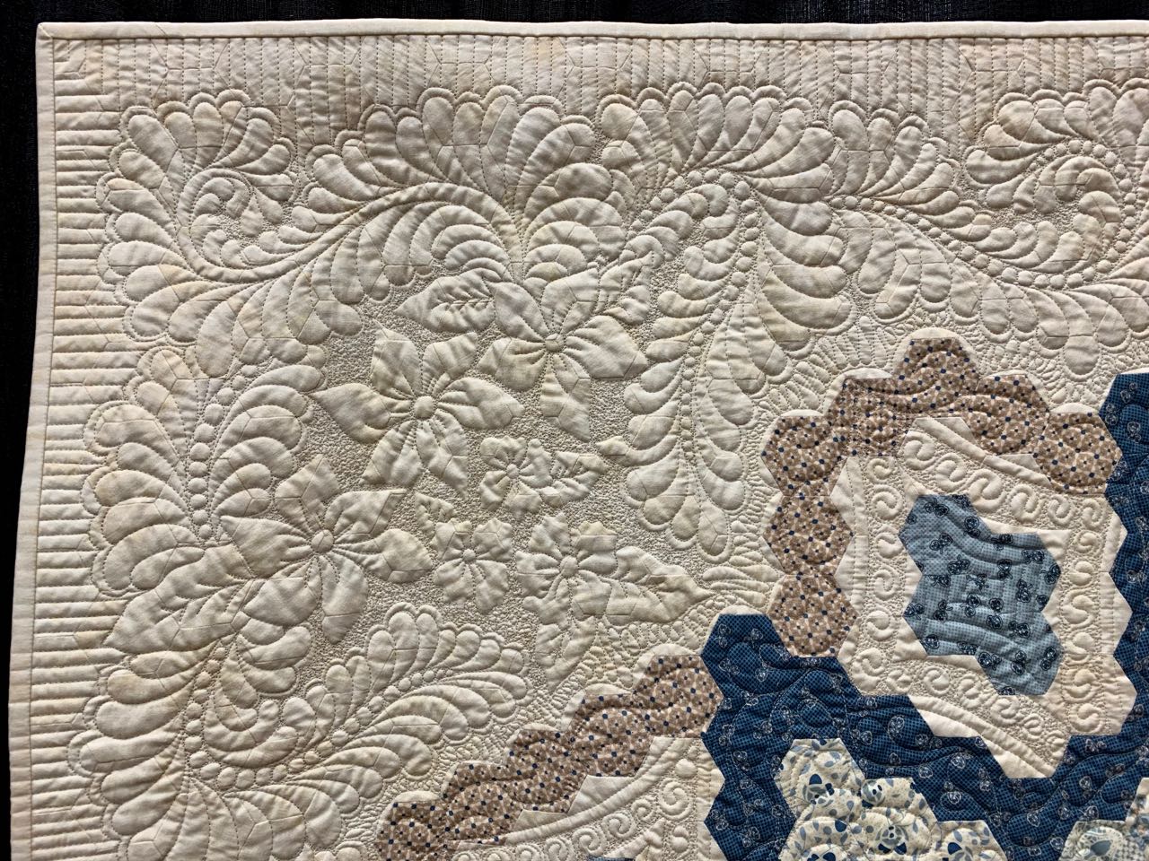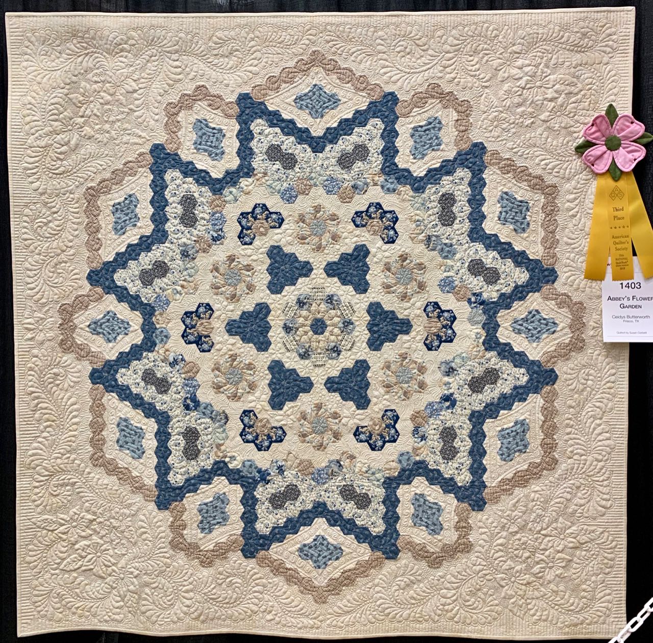 Okay, let's start with that we love the name Ceidys, then take a look at her fantastic quilt. Based on the design Forget Me Not Sew Along by Sue Daley, Abbey's Flower Garden by Ceidys Butterworth (63" x 63") won 3rd Place in Small Wall Quilt 1st Entry in an AQS Paducah Quilt Contest. The quilting was done by Susan Corbett on a movable machine and instantly grabs your attention. The flowing feathers with well placed flowers catch your eye first, but as you look around you suddenly say, "Are those hexies?" Beautiful design, colors, and artistry.