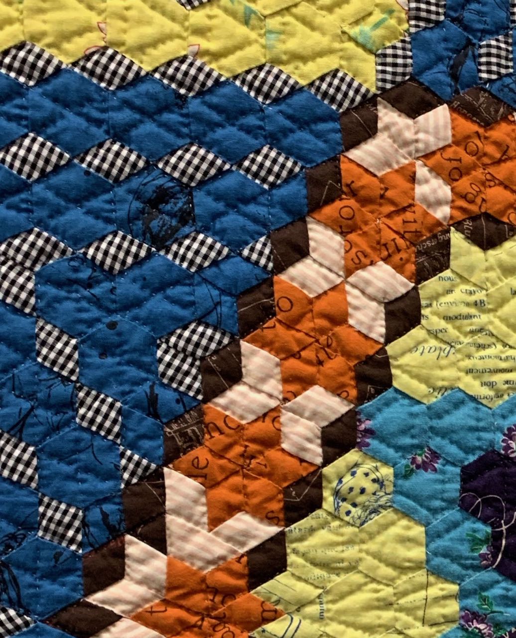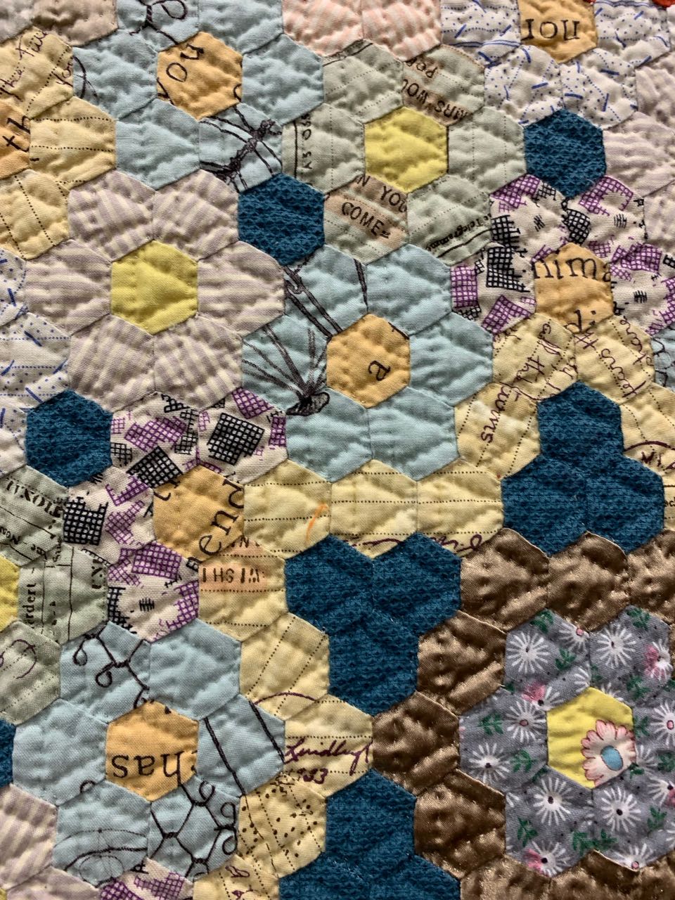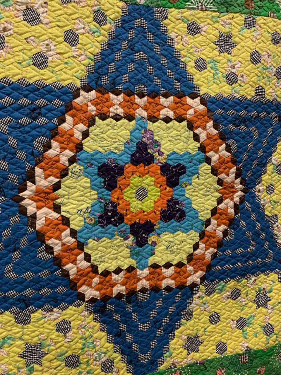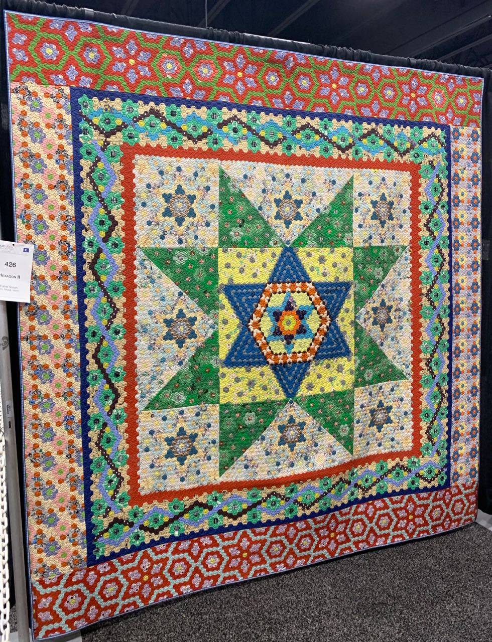 "I really wish I had taken more pictures of this quilt. Even in the close ups I couldn't figure out how it was planned and constructed. At first I thought that it was some hexies and some diamonds in between. Then I realized it is probably all hexies. It is very hard to tell which parts belong to which hexies. She broke many of the hexies into three diamonds and used the fabrics to create secondary designs. And how did she get straight lines on the star???? Amazing!"