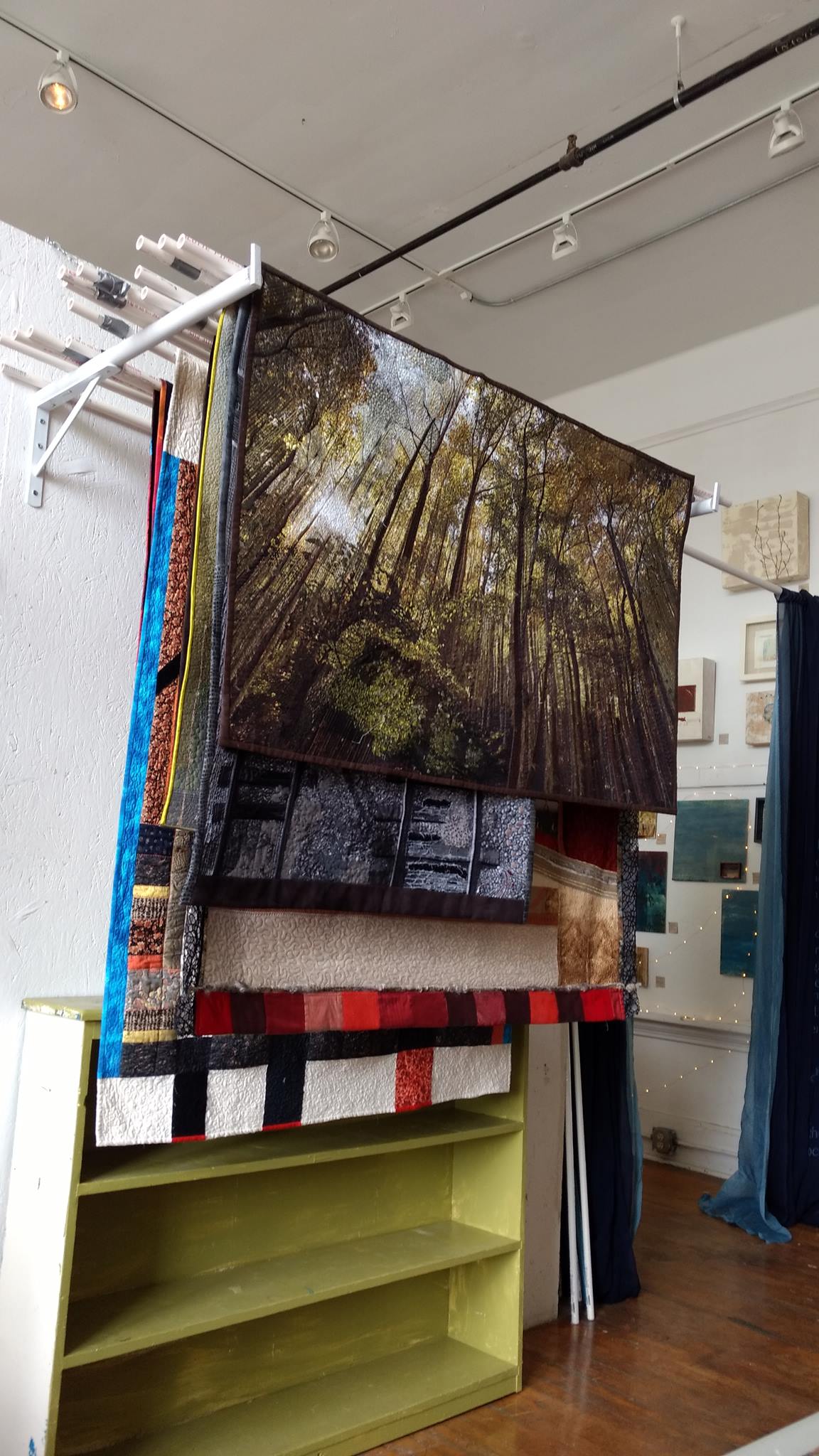 In case you are looking for a good way to store/display your art quilts... Here is what I have done with 2 shelf brackets, 1 closet rod (cut), and plumber's pipes. The chain is for security, but may not be needed depending on how secure your brackets are.Jill knows a thing or two about quilting as well as she was one of two artists featured in the Special Exhibition Rising Stars at Houston 2018. The annual Rising Star exhibit features the works of specially selected quilt artists who have developed and demonstrated substantial creative growth over recent time. Ricky sat down with her to talk about the honor and to look at some of her quilts.
