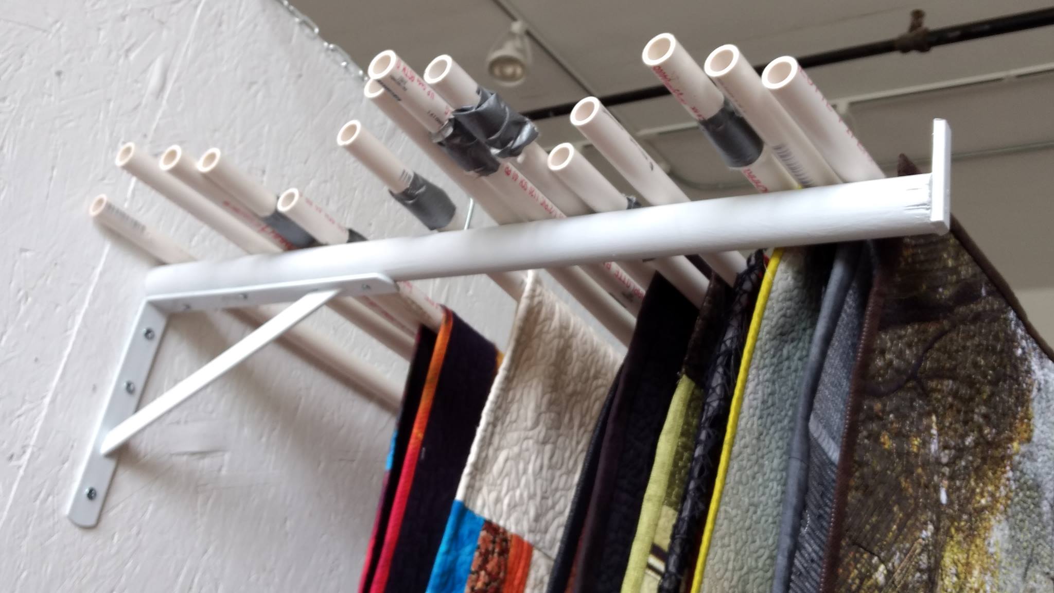 Jill Kerttula recently re-posted a great tip for storing your quilts. It involves 2 shelf brackets, 1 closet rod (cut), plumber's pipes, and chain.