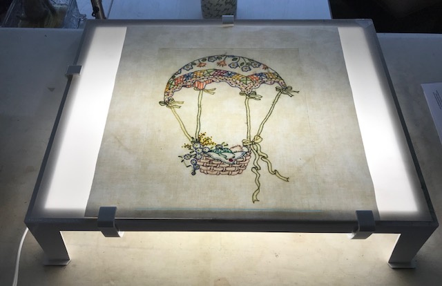 So, you ask what this all has to do with stitching, LOL...well, I am headed down to another 1st birthday celebration! My sister's granddaughter is turning one and having a "Dol" celebration and I decided to make something special. I have stitched up the sweetest Crabapple Hill Studio design using the color crayon technique and embroidery. You can see a demo of the crayon technique on Quilt Roadies May 8th video. But, I wanted to add the birthday girl's name to the stitchery. I printed off the size and font I wanted from my computer after testing a few. Then, using my Me Sew Light Table, I was able to trace a perfect script of her name onto the project!