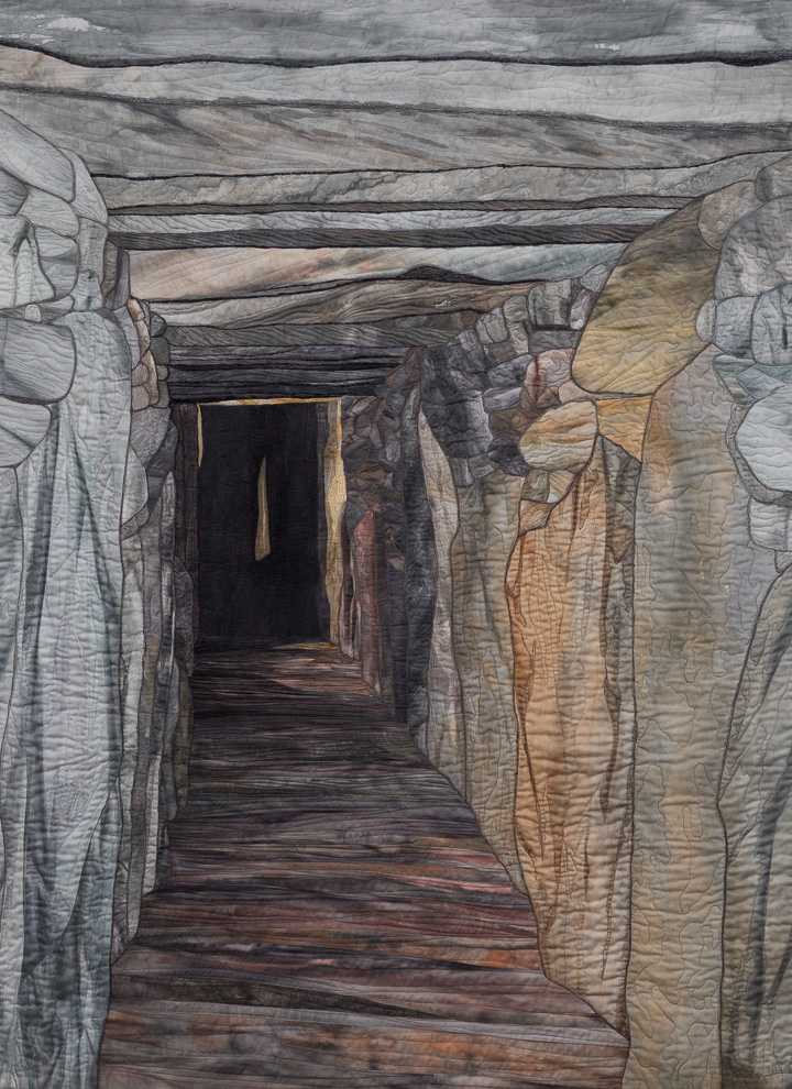 Denise Labadie creates portraits of Celtic megalithic stones and monoliths, and more recent monastic ruins. These stonescapes – stone circles, standing stones, dolmens, burial tombs, abandoned churches, forgotten cemeteries, and lost-in-history portals and passageways – are both timeless and evoke deep remembrances of human pasts largely forgotten. Labadie's quilts are known both for their surprising emotionality, large size and, from a construction standpoint, their hand-painted fabrics, textures, color gradation, shadowing and perspective, depth of field, craftsmanship and technique precision.