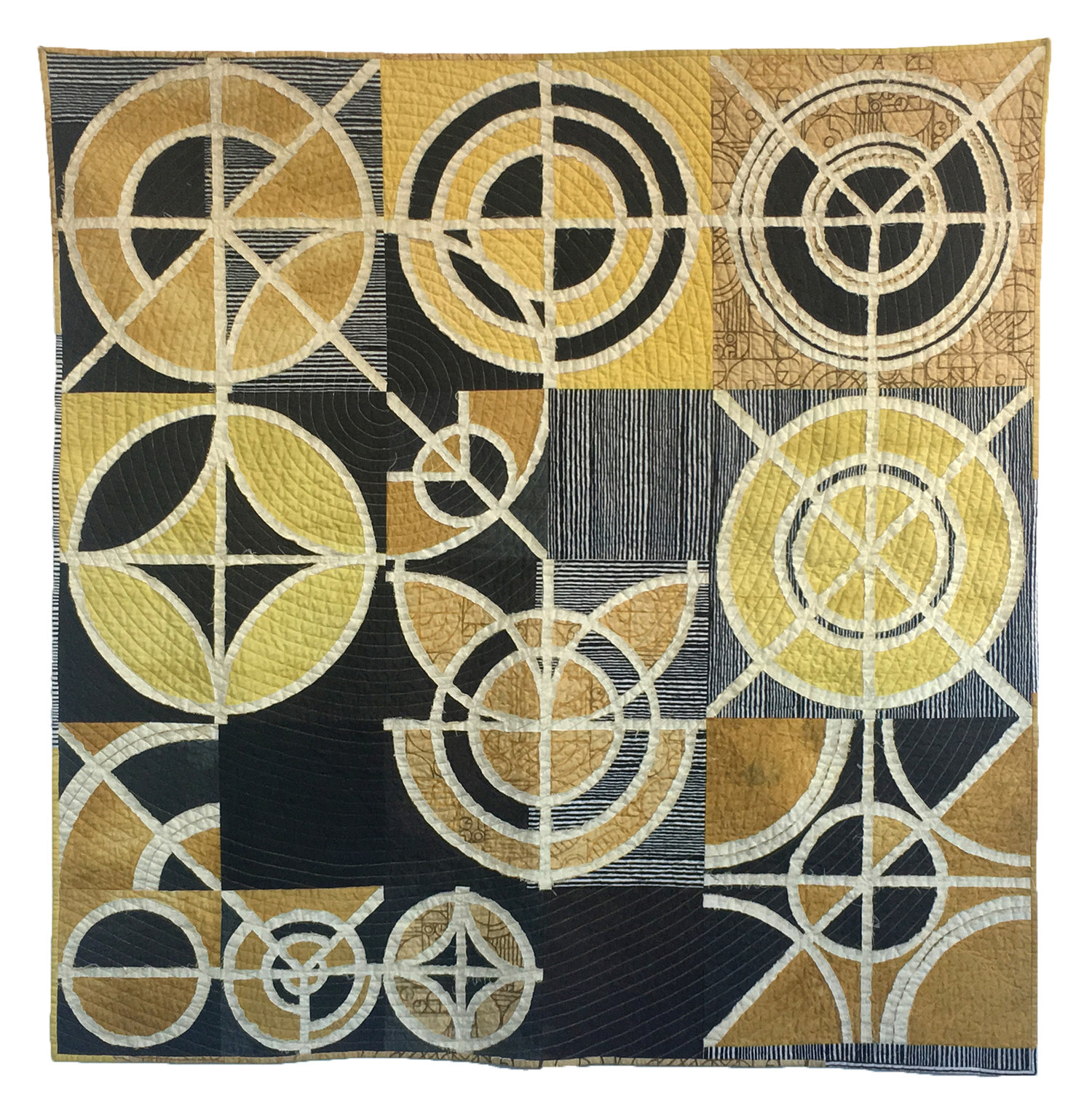 Total Eclipse of the Pivot was created using hand dyed fabrics using marigold, weld, and walnut, along with striped fabric from Kim's "imbue" line of modern batiks. It is made from three layers of cloth, stiched together and then cut to reveal layers of color and texture below.