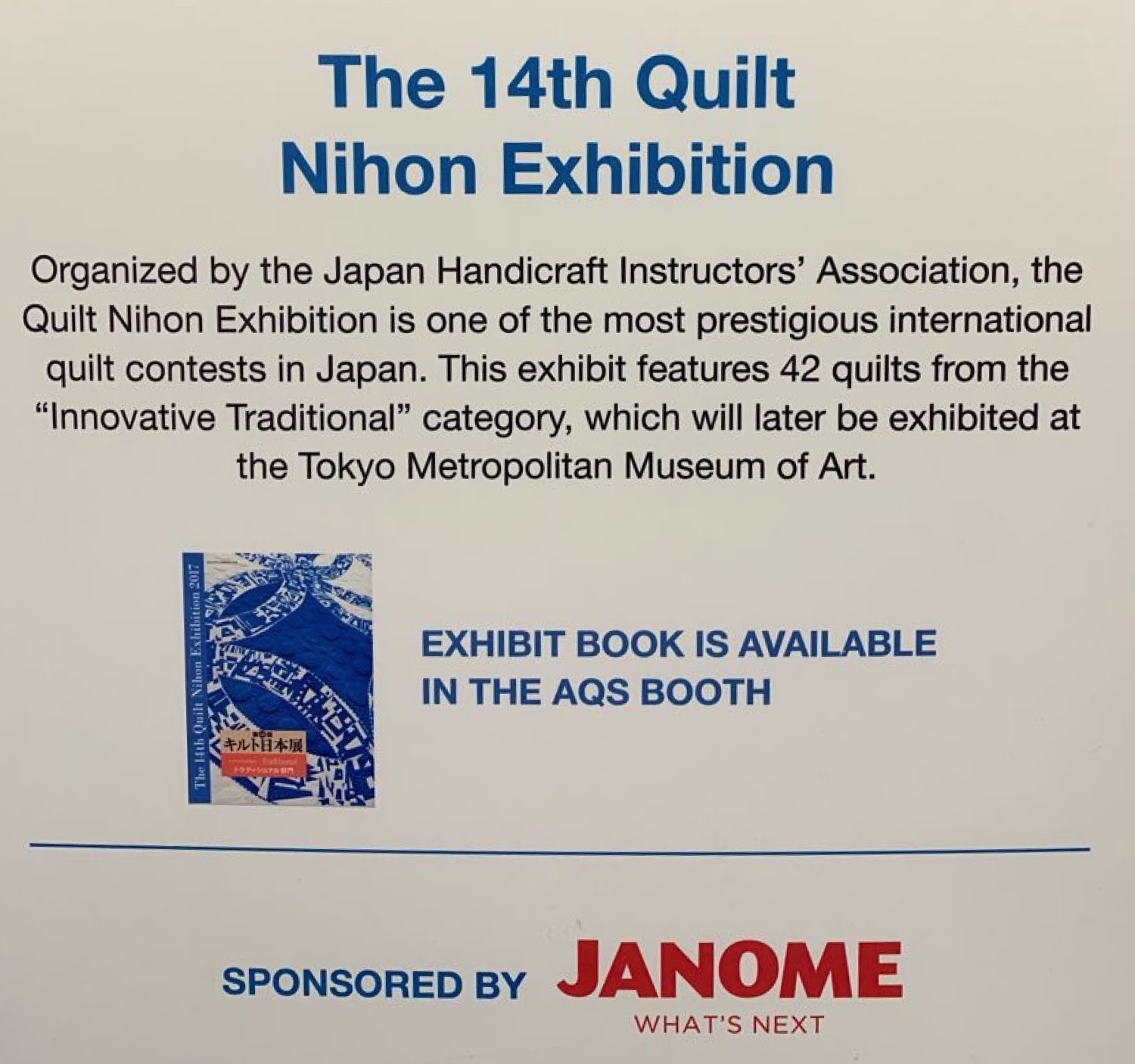 "Organized by the Japan Handicraft Instructors' Association, the Quilt Nihon Exhibition is one of the most prestigious international quilt contests in Japan. The exhibit features 42 quilts from the "Innovative Traditional" category, which will later be exhibited at the Tokyo Metropolitan Museum of Art."