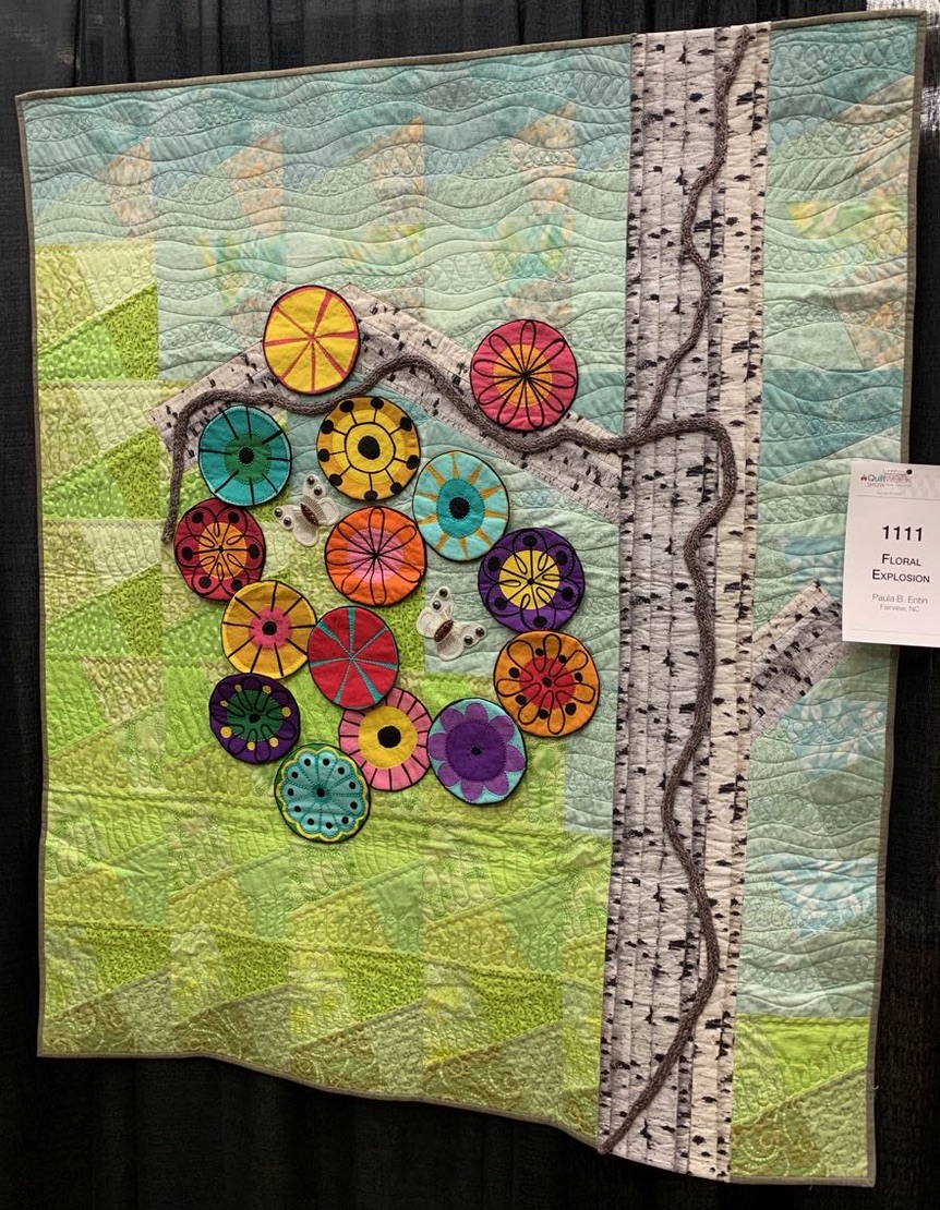 Fiber artist Paula Entin creates original art quilts inspired by her life. This beautiful quilt, Floral Explosion, (48" x 56") delighted us with its colors and unique use of embellishments in the flowers and creeping vine.