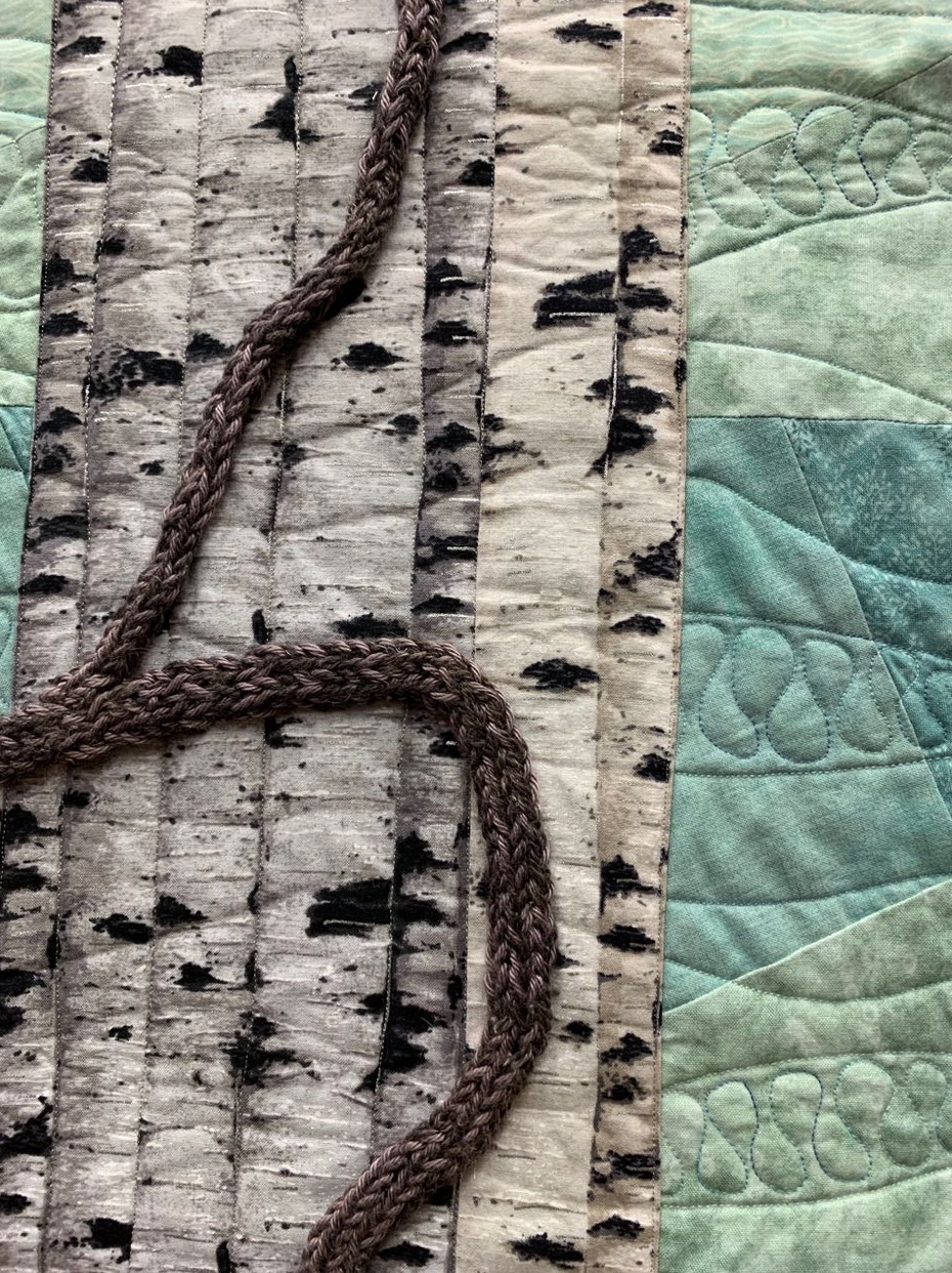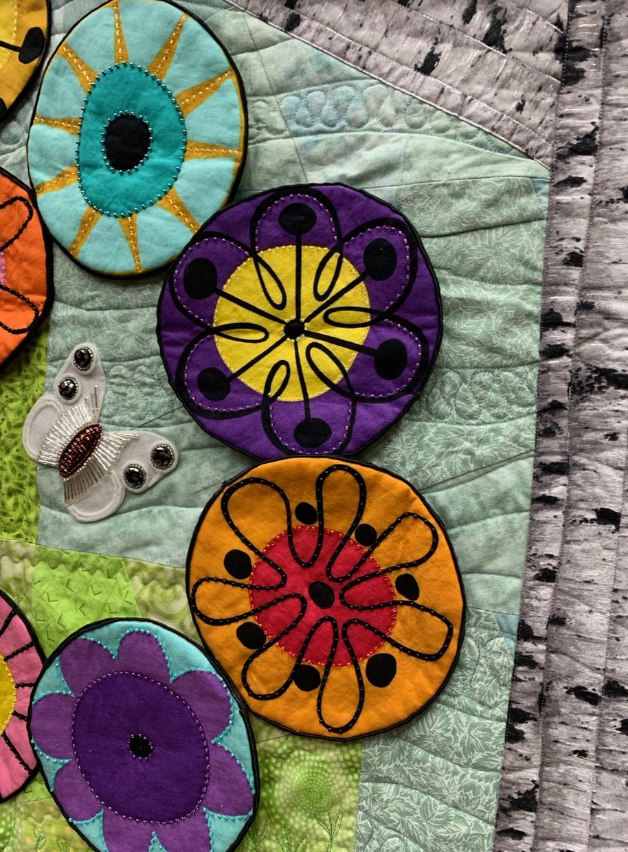 Paula used fused appliqué, hand appliqué, machine appliqué, beading, embellishments, free-motion quilting, and machine piecing.