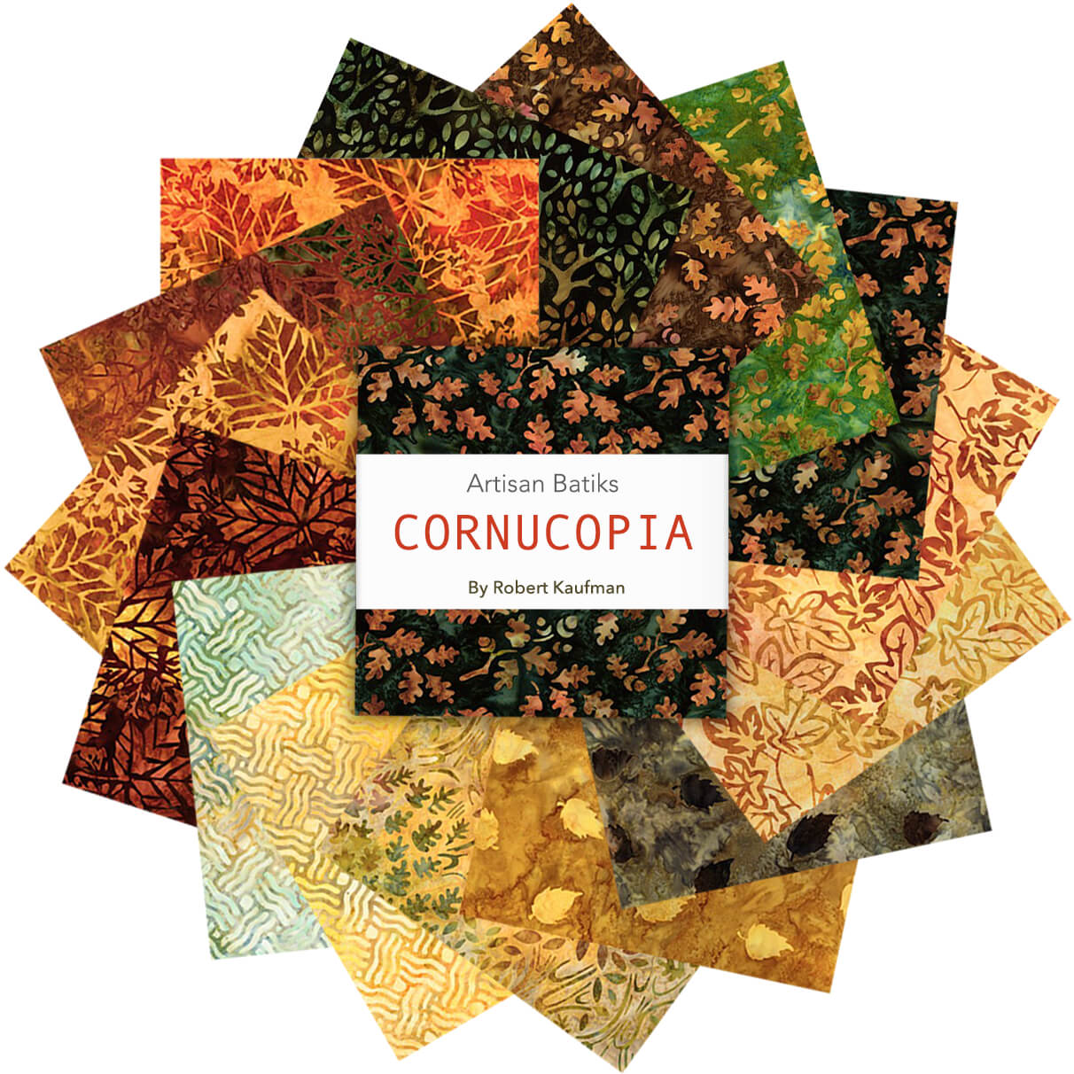 This beautiful collection of autumnal batiks from the "Artisan Batiks" collection designed by Lunn Studios for Robert Kaufman features 20 different batik fabrics with leaf and acorn motifs in shades of brown, green, orange and gold.