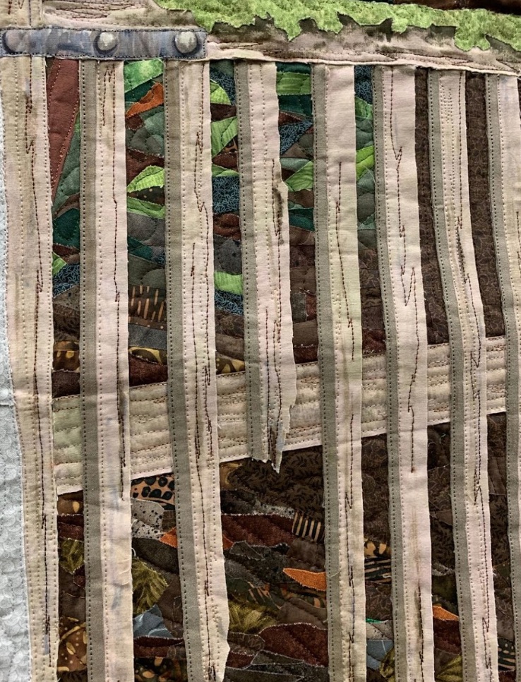 Based on a photograph of the Lake District in England, The Gate by Irene Foss was so realistic it had us wondering what we would see if we could just get passed it and into the wonderful wilderness beyond. Irene used many different techniques to achieve the effect including Fused Appliqué, Collage, Confetti, Free-Motion Quilting, Fabric Painting, and Thread Painting.