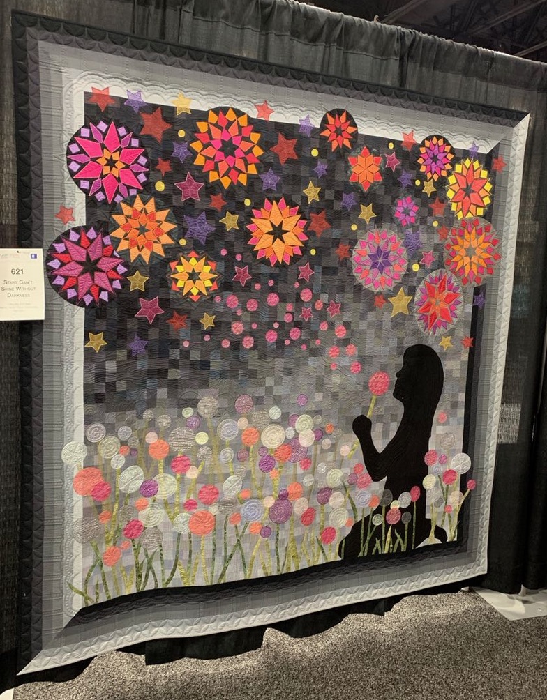 Stars Can’t Shine Without Darkness was created by Claudia Scheja and honors her daughter who was born with a brain tumor and only lived for a few short weeks. Claudia's quilt honors her 25 years later and reminds her of her angel in heaven. It is a loving tribute by a skilled quilter.