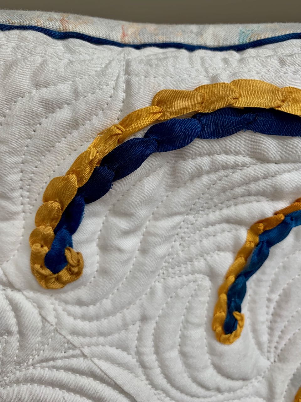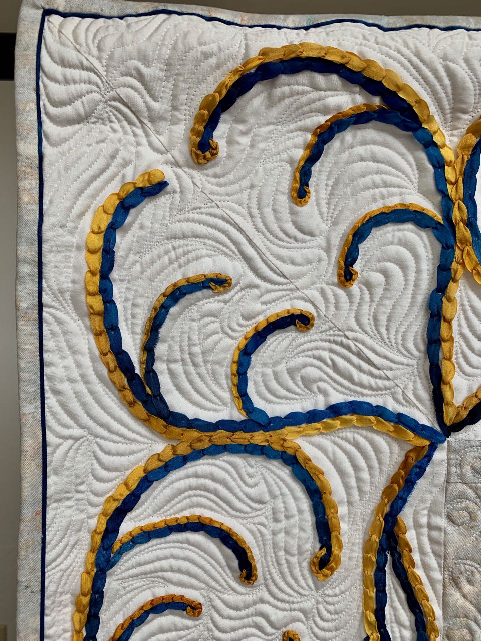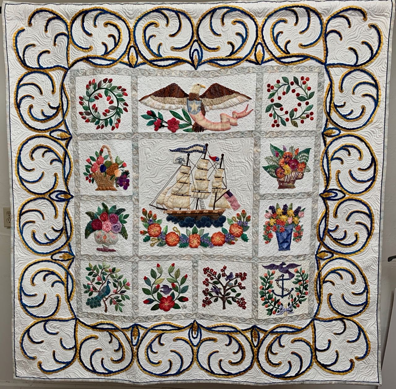 The longarm quilting was done by Shireen Hattan – I met Shireen at a Volleyball Fundraiser! She had donated a quilt to support our Scholarship fund and I enjoyed talking to her. She let me know she was in the longarm business and gave me a card. I realized that with a small bedroom studio, I was not going to be a longarm quilter and I needed to join forces with a quilter that shared my aesthetic. It wasn't long before I was sending her Wedding quilts and T-shirt quilts. We shared a common vision for each quilt. I let her know when I want something specific, like feathers or bamboo, and also where she can leverage her skills and expertise for the quilting. I have never been disappointed! For the T-shirt quilt I made for my brother and a wedding quilt she added words that were perfect for the quilt and the sentiments attached. When I finished Americana Baltimore I realized I was not going to hand quilt it and I needed to get Shireen involved. The only direction from me was to make the quilting on the Clipper Ship block look like wind and the rest of the shapes "organic". I was thrilled when the quilt came back, in fact, I am thrilled every time a quilt arrives!